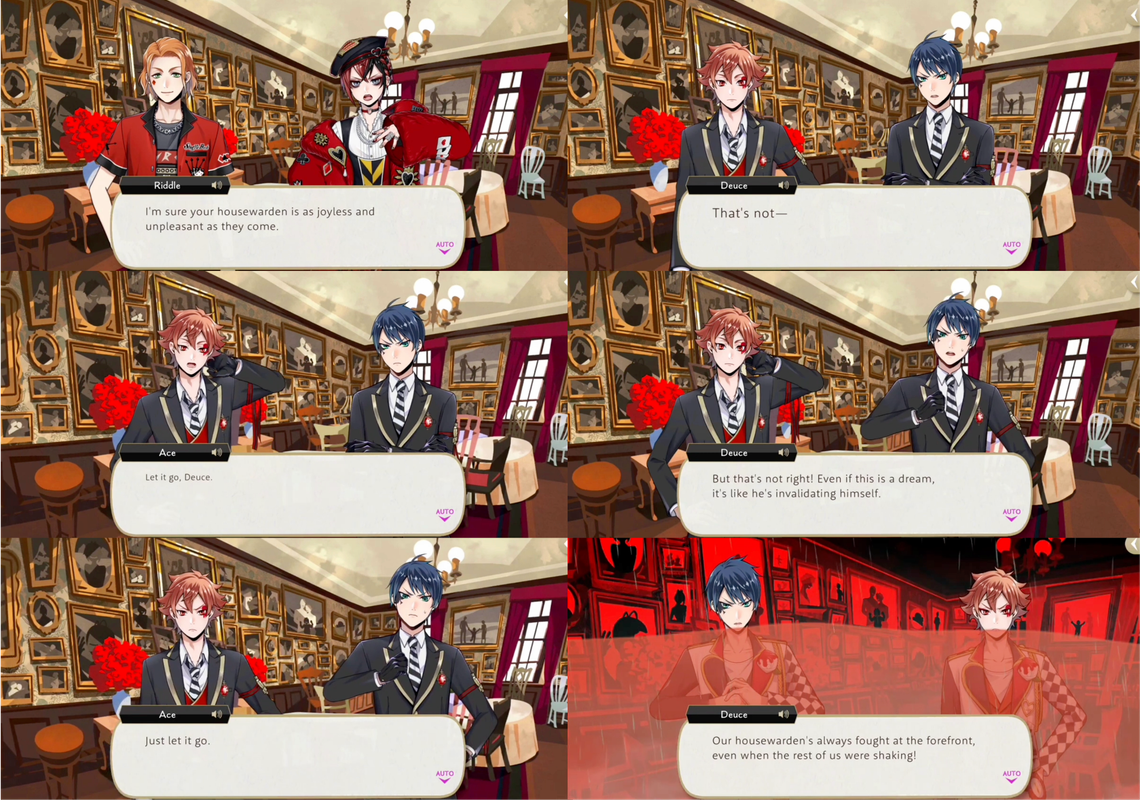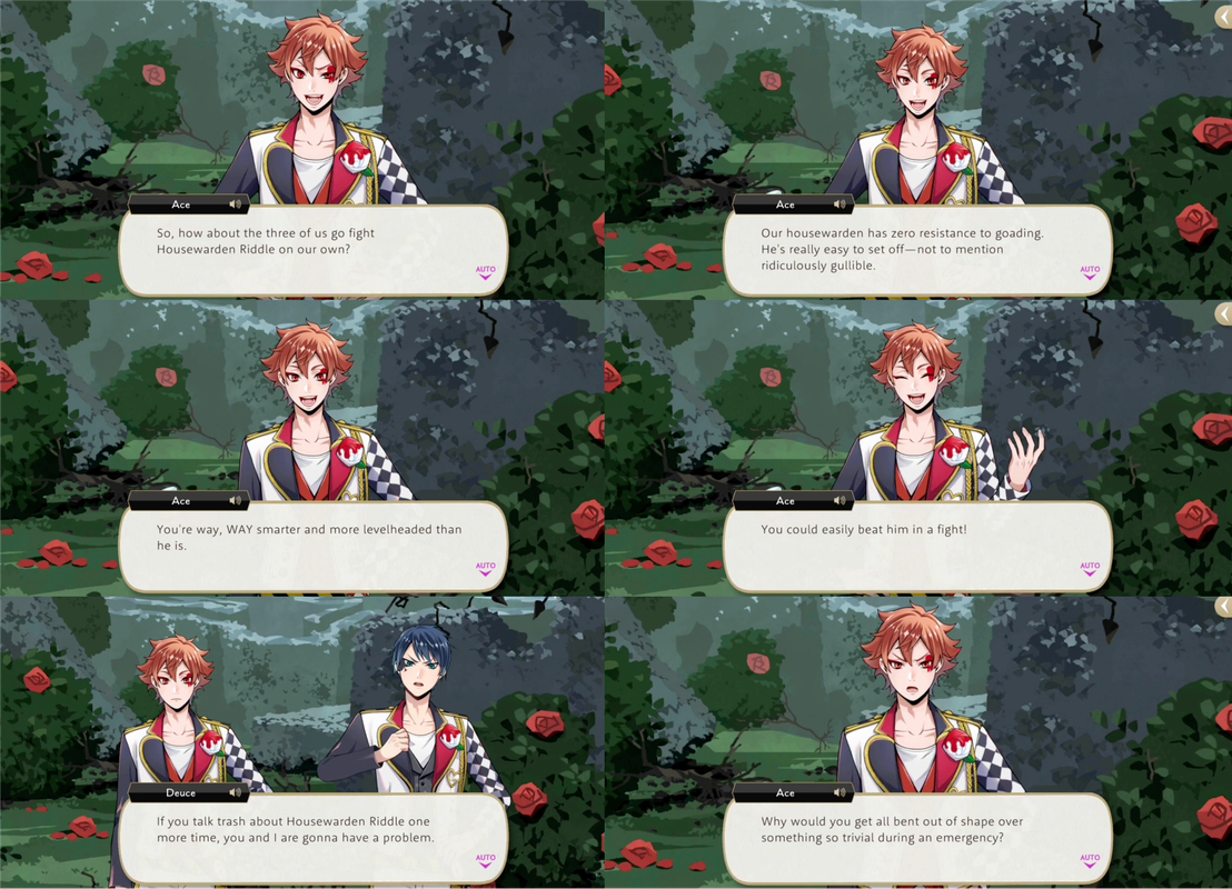 When the Riddle of his own dream in Book 7 assumes that the Heartslabyul housewarden must be “as joyless and unpleasant as they come” for his love of rules Deuce tries to defend Riddle (“But that’s not right! Even if this is a dream, it’s like he’s invalidating himself”), but Ace holds him back.