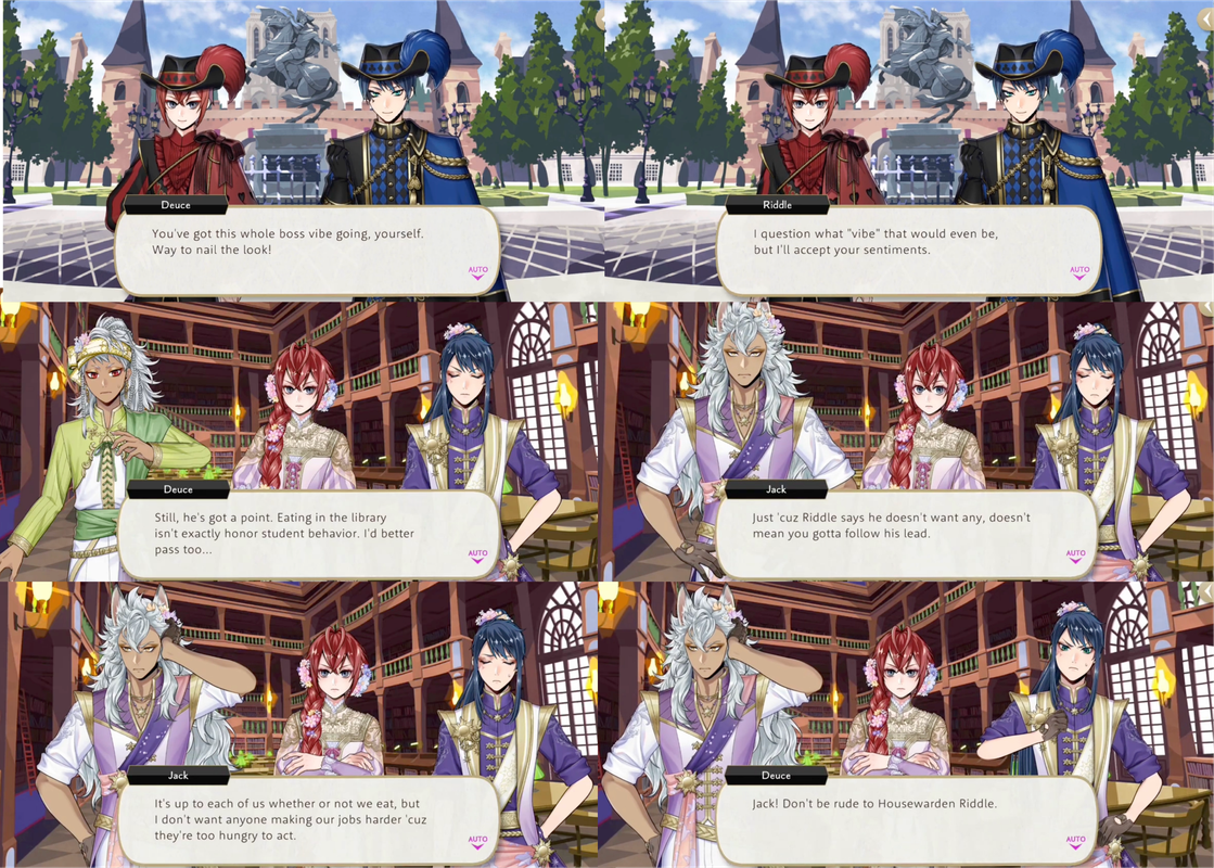When Riddle refuses to eat in the library during the Lantern event Deuce decides that he will abstain as well. Jack says, “Just ‘cuz Riddle says he doesn’t want any, doesn’t mean you gotta follow his lead” and he doesn’t want the others making mistakes from being too hungry to act. Deuce responds, “Don’t be rude to Housewarden Riddle.”