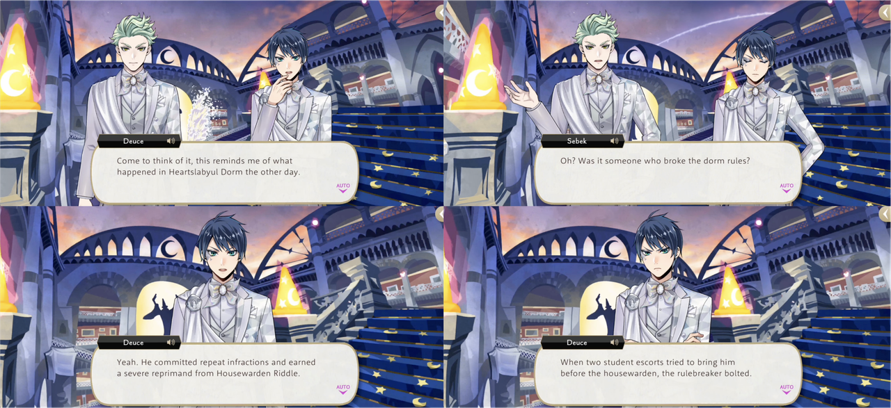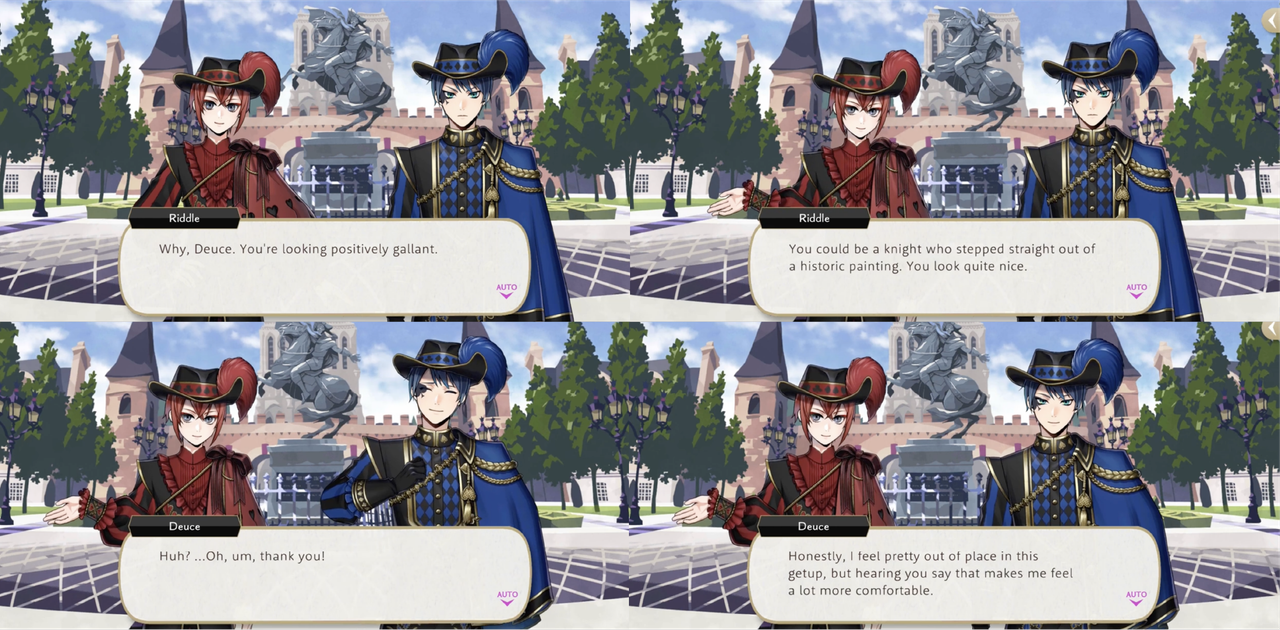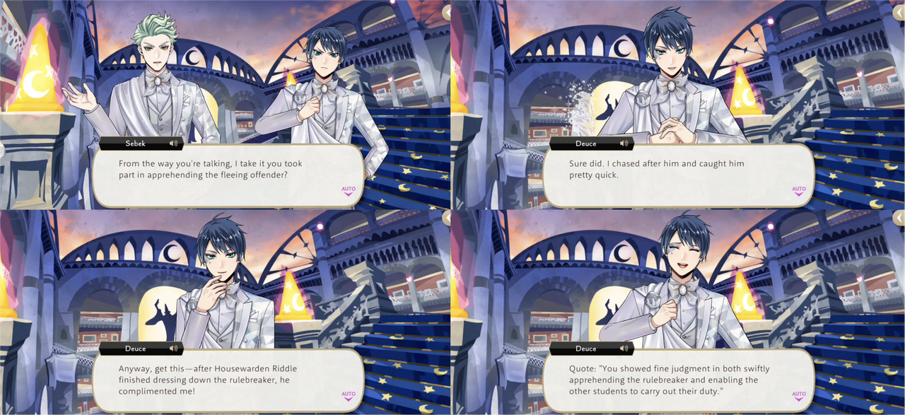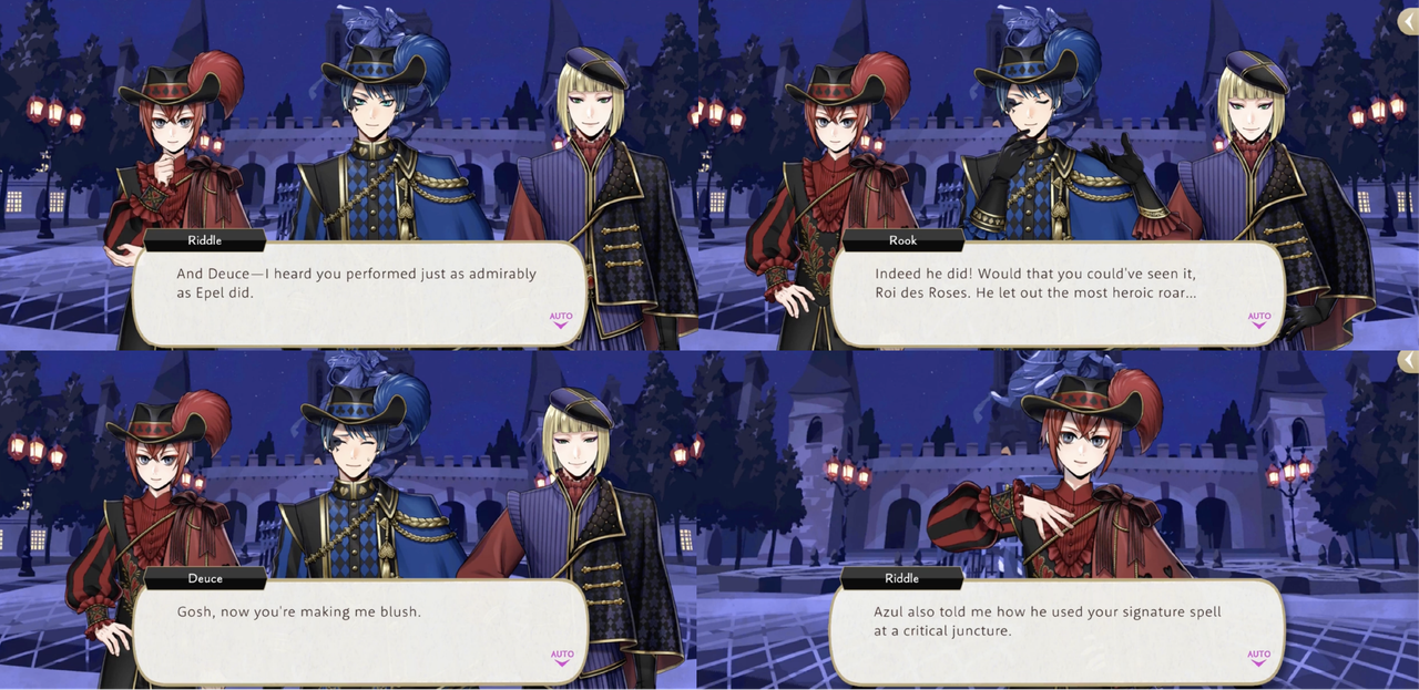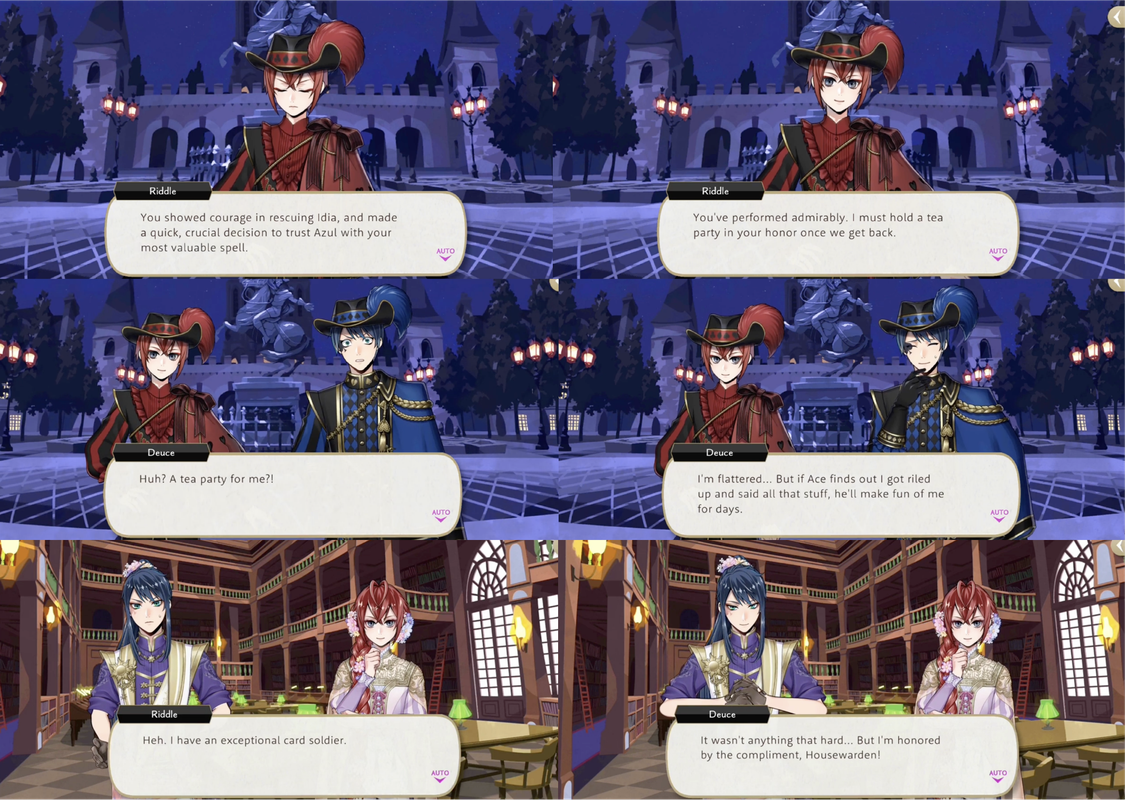 Deuce also seems pleased when Riddle compliments his Glorious Masquerade outfit (“hearing you say that makes me feel a lot more comfortable”), and after hearing of Deuce’s exploits from Rook Riddle praises him for his courage, offering to hold a tea party in his honor at Heartslabyul.