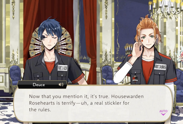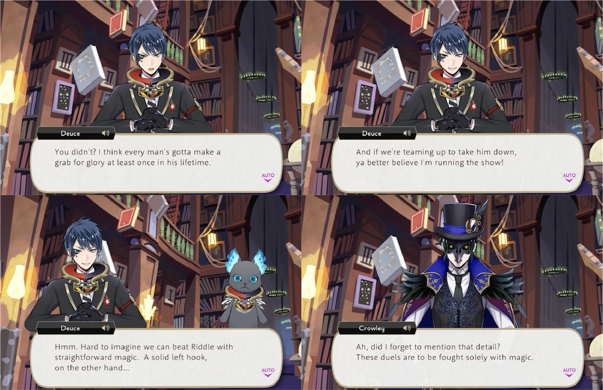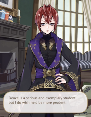 Deuce is the only Heartslabyul student to ally against Riddle with Ace in Book 1, and joins Ace in challenging Riddle for the position of housewarden, though he at first intends to use physical assault rather than magical.