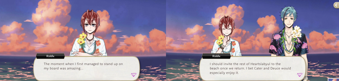 After trying to surf for the first time Riddle says he wants to invite the rest of Heartslabyul to the beach sometime, as Cater and Deuce would especially enjoy it.