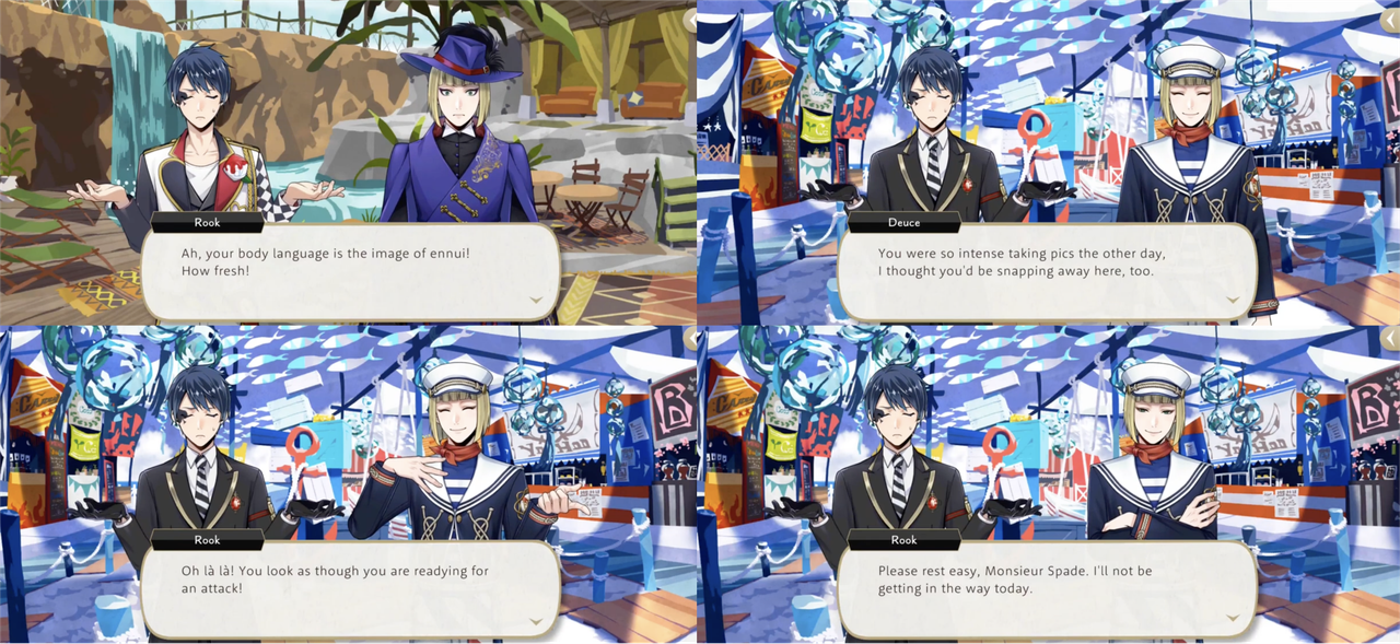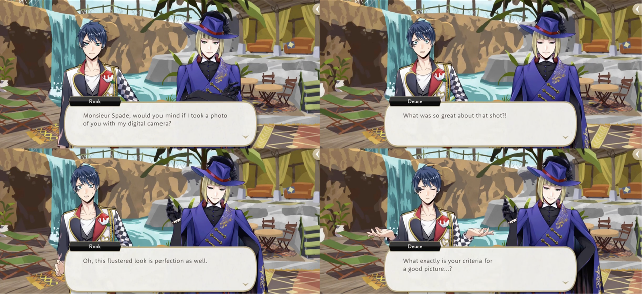 Rook and Deuce also overlap during Port Fest where Rook asks Deuce to model for him, though Deuce struggles to understand Rook’s criteria for a good picture. (Rook: “Your body language is the image of ennui! How fresh!”)