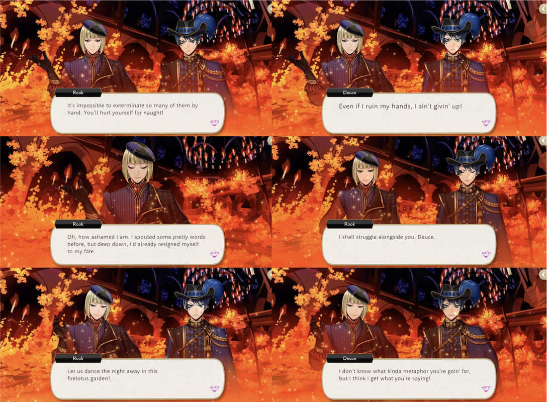 When Rook later tells him that it impossible to exterminate the flowers Deuce still refuses to give up, and Rook admits that he had already resigned himself to his fate, ultimately deciding to struggle alongside Deuce, instead: “Let us dance the night away in this firelotus garden!” (Deuce: “I don’t know what kinda metaphor you’re goin’ for, but I think I get what you’re saying!”)