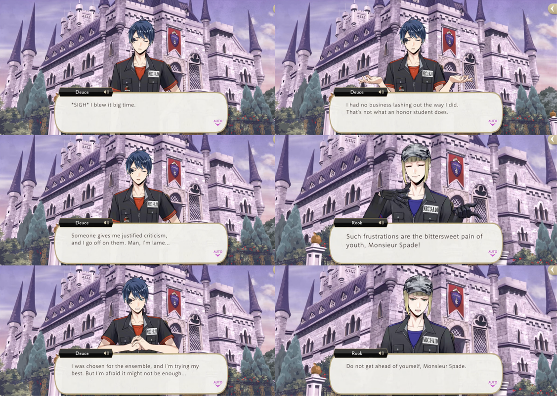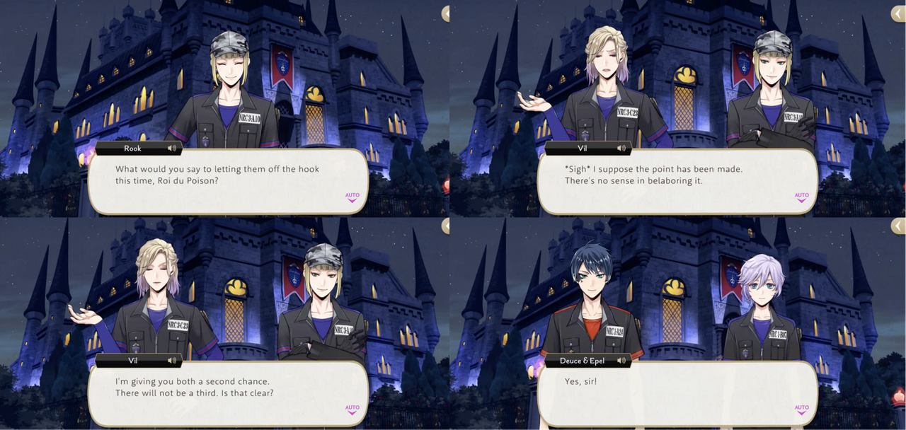 Soon after Deuce takes a blastcycle and Epel off campus, getting into a fight on a beach. Vil is not amused but Rook asks him to forgive the two first-year students.