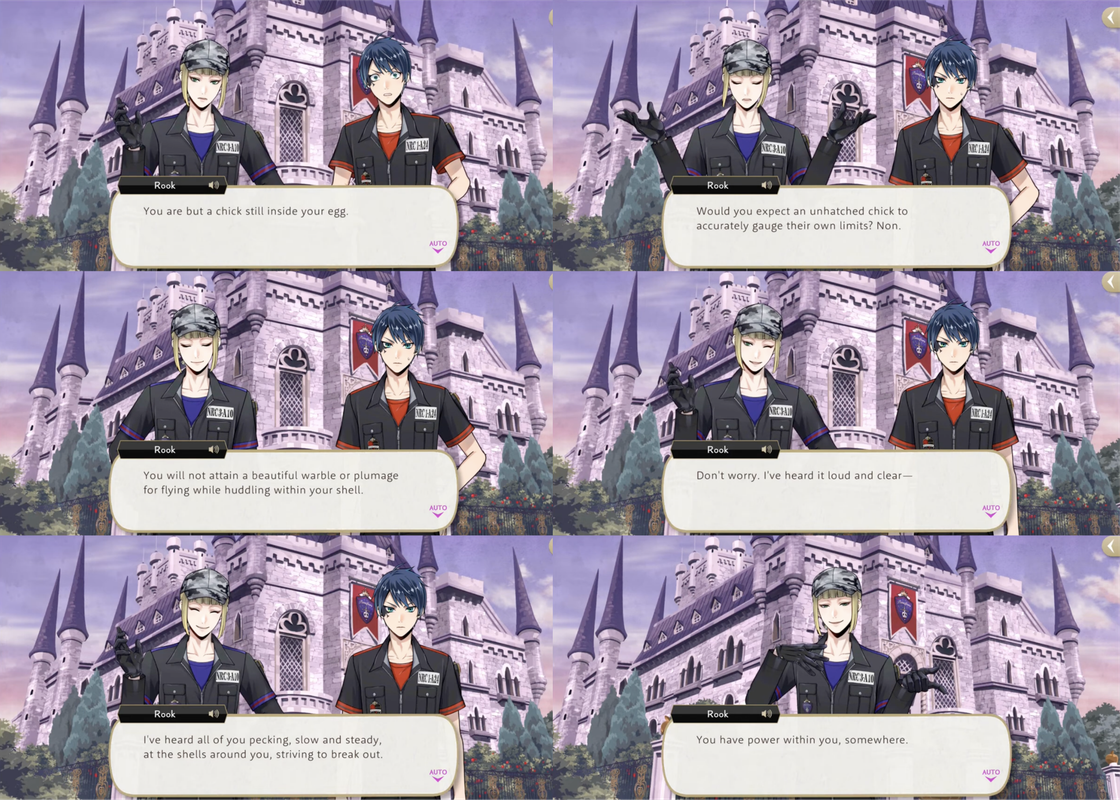 After Deuce leaves a VDC rehearsal in frustration in Book 5 in response to Ace mocking his intelligence Rook follows him, giving him a lecture on the power that Deuce has within himself: “Would you expect an unhatched chick to accurately gauge their own limits? Non.”