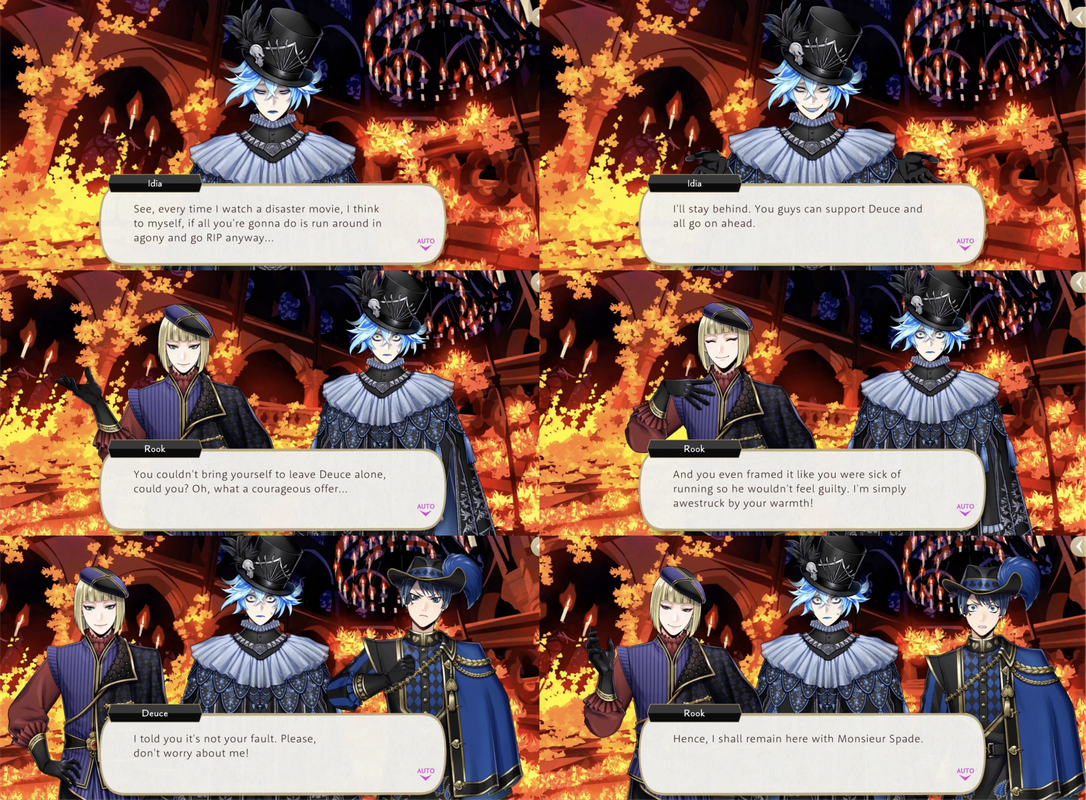 After Deuce injures himself in the process of saving Idia from a falling chandelier during Glorious Masquerade Idia volunteers to stay behind with him (“Why get all worked up trying to escape when you could just kick back, chill, and go out peacefully?”).
