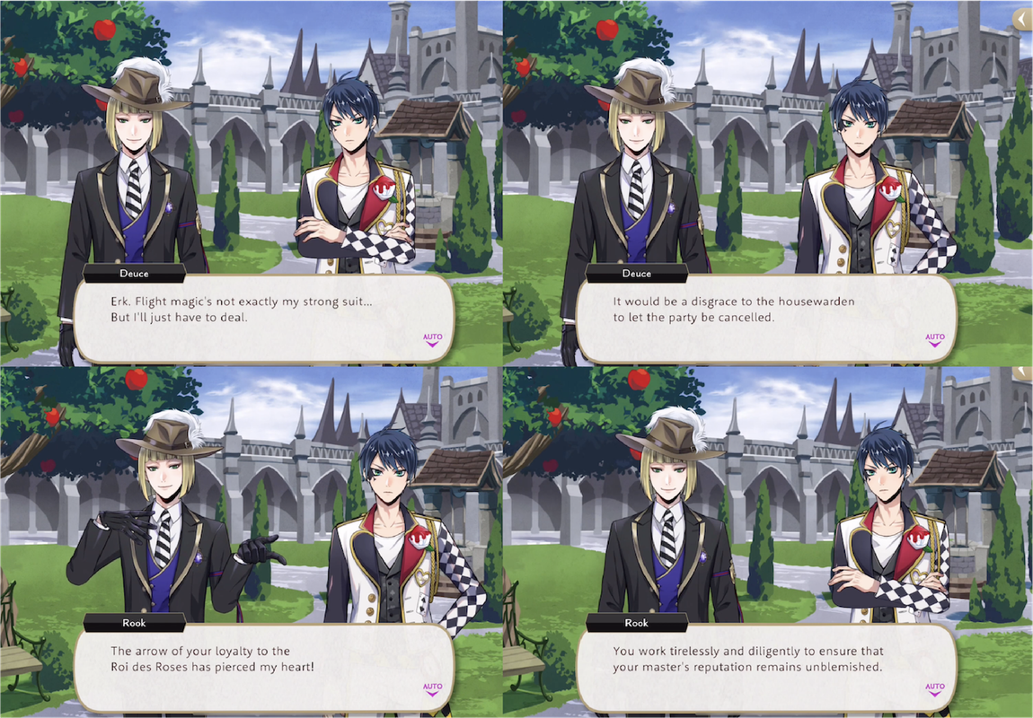 Rook suggests that Deuce try and herd the flamingoes with flight magic. Deuce responds that flight magic isn’t a particular strength of his, but he does not want to disgrace his housewarden by letting an uncoming unbirthday party be cancelled. Rook responds, “The arrow of your loyalty to the Roi des Roses has pierced my heart! You work tirelessly and diligently to ensure that your master’s reputation remains unblemished.Such pure devotion! What can that be called, if not beautiful?,” and volunteers to help Deuce with the flamingoes.