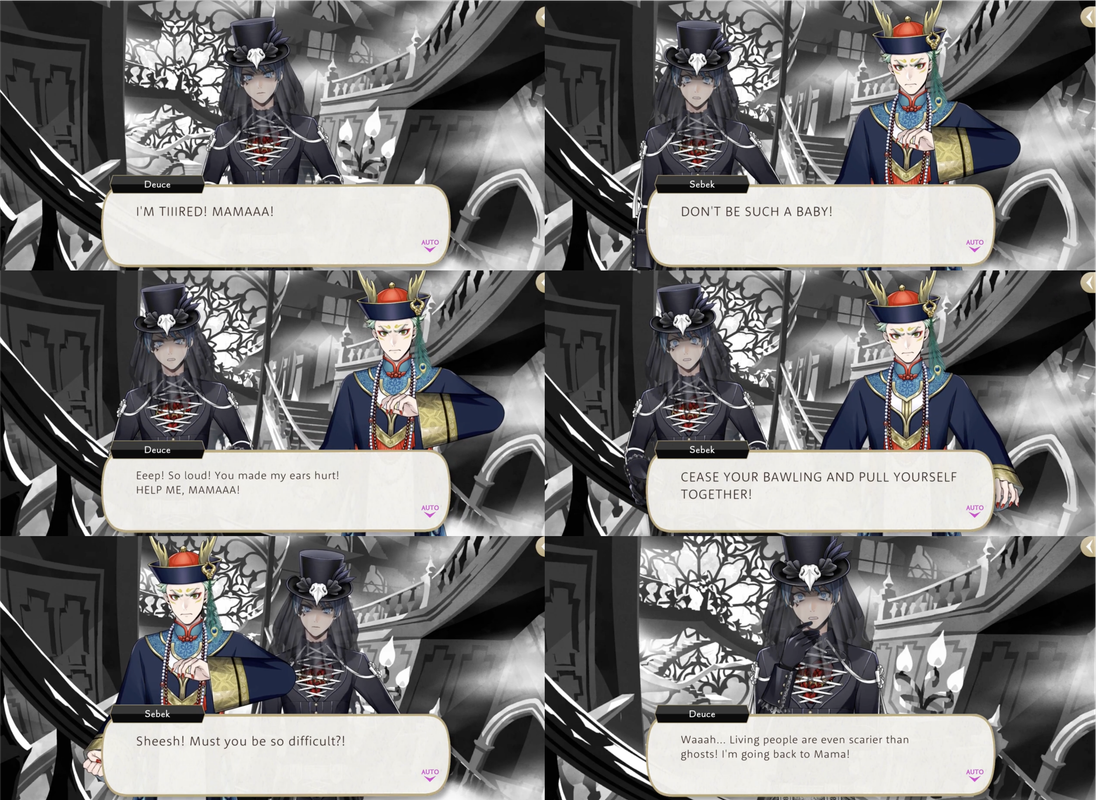When Deuce is possessed by a ghost that cries for its mother during Spectral Soiree Sebek is not patient with him, and makes fun of him once his consciousness has returned.