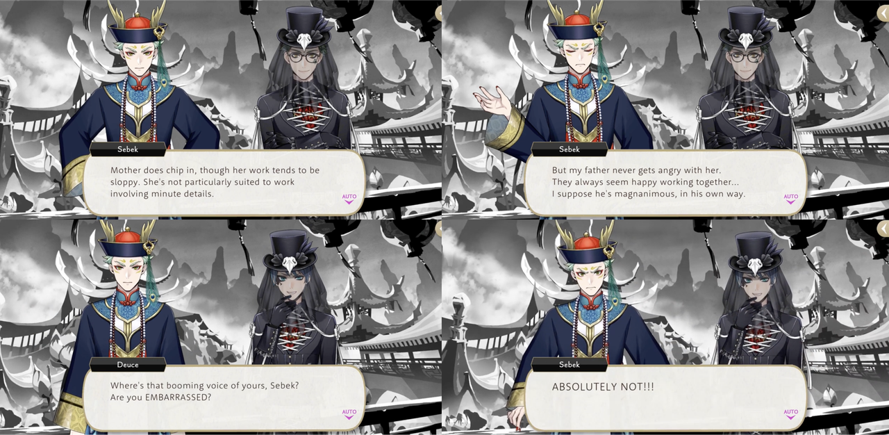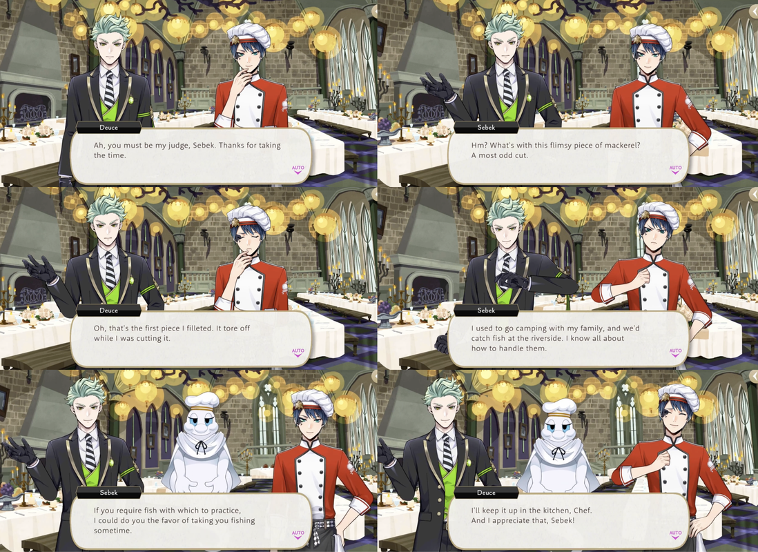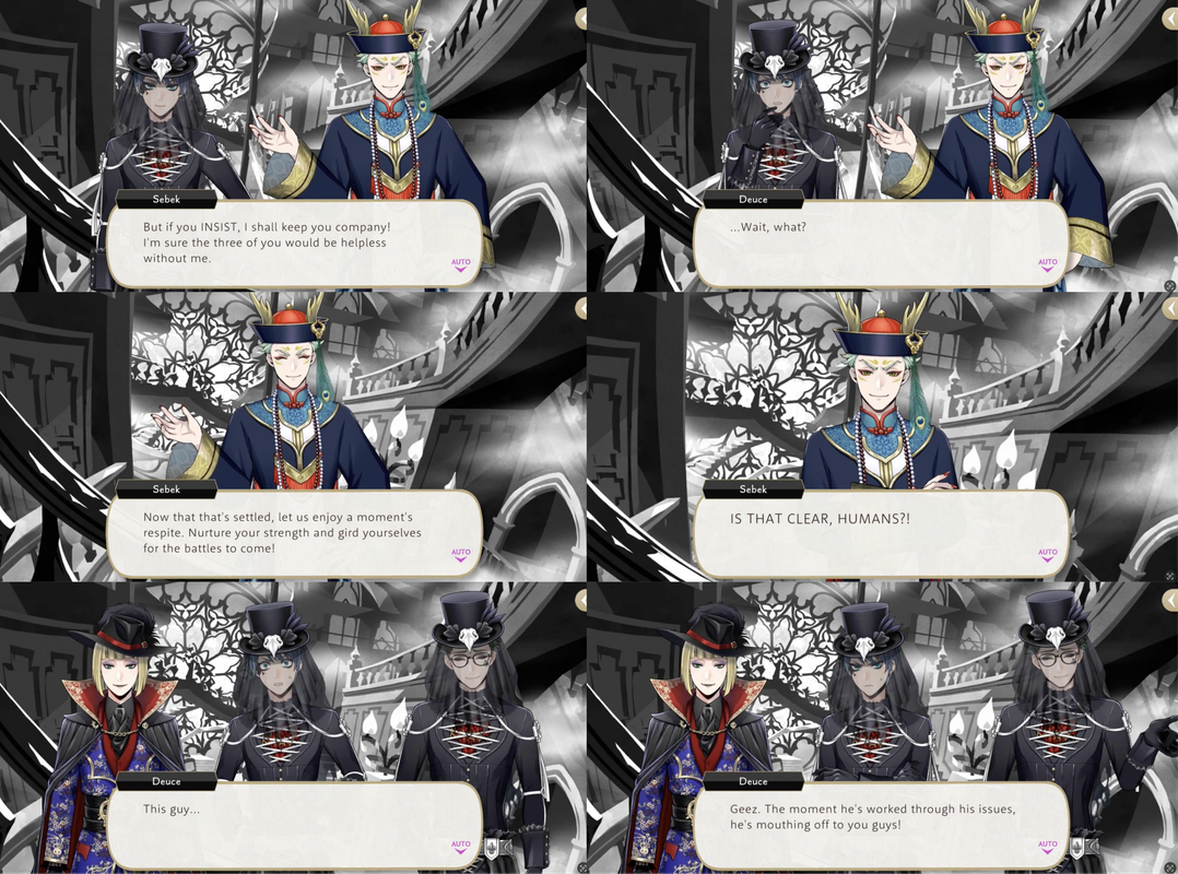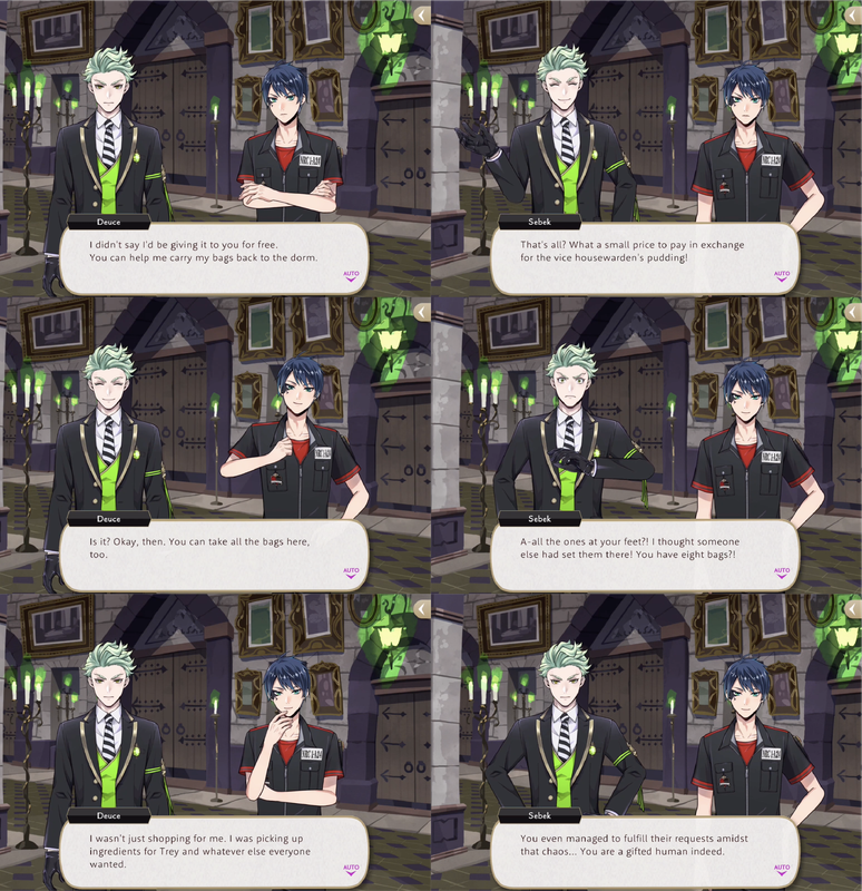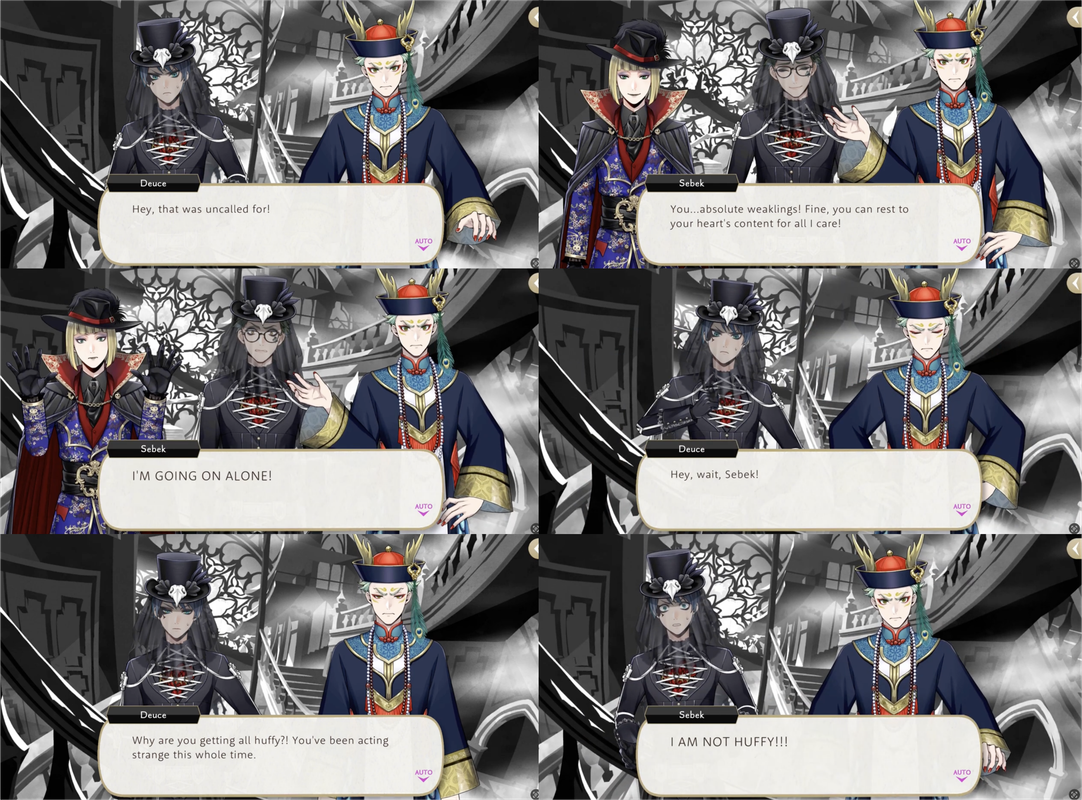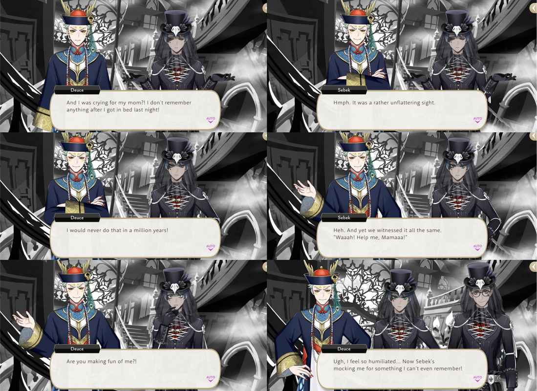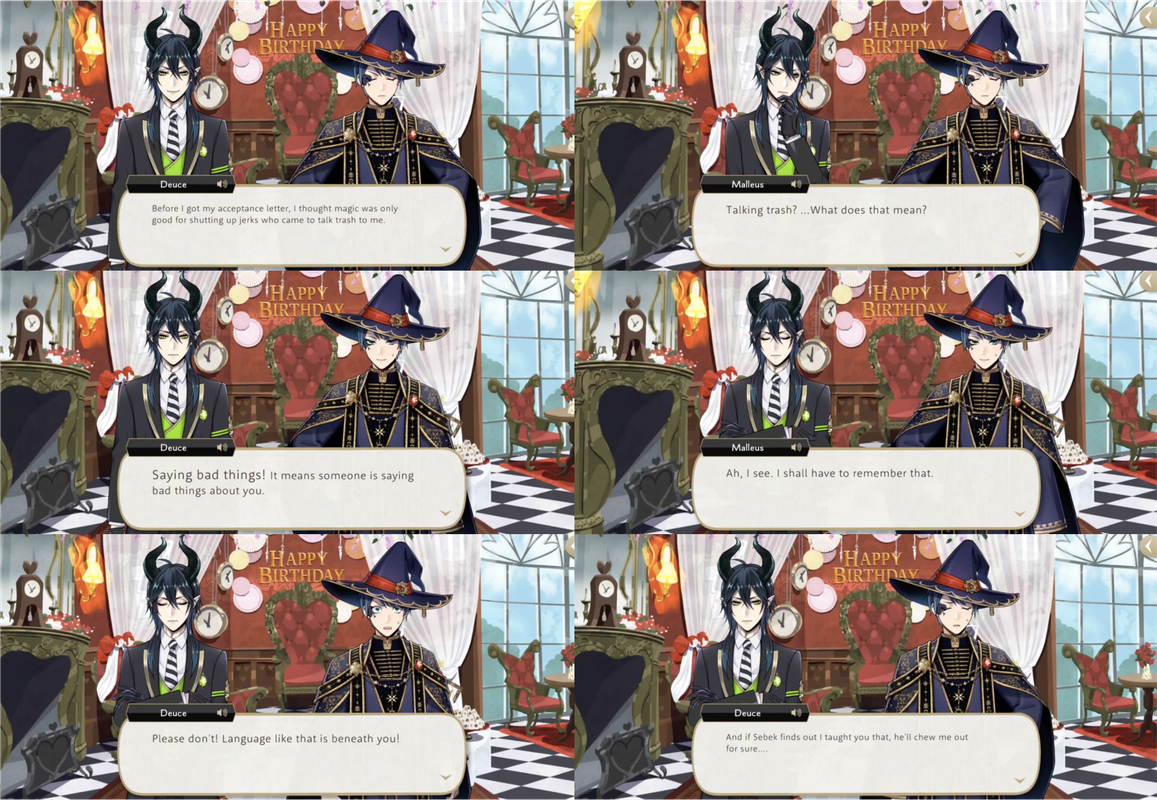 Deuce accidentally teaches Malleus what “talking trash” means in a vignette, and when Malleus decides to remember the terminology Deuce responds, “Please don’t! Language like that is beneath you!And if Sebek finds out I taught you that, he’ll chew me out for sure….”