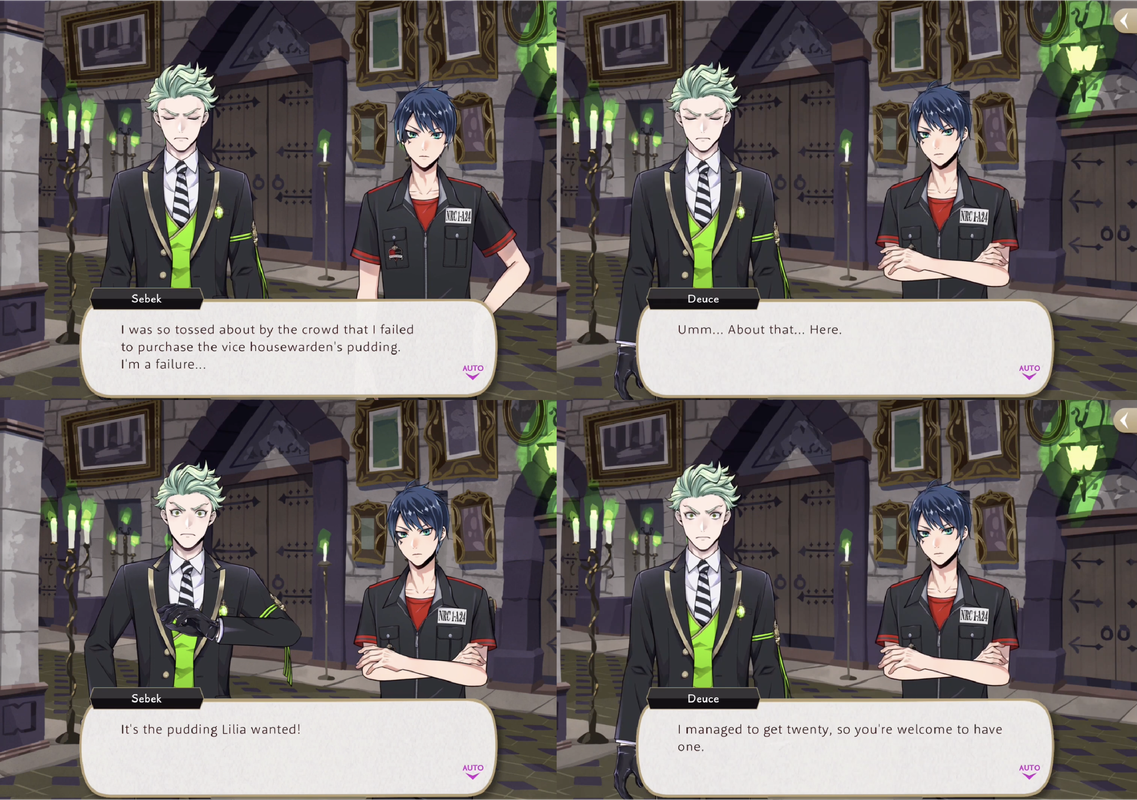 Having failed in his task to purchase pudding for Lilia, Deuce gives him one of the twenty that he bought in exchange for help carrying his eight shopping bags to Heartslabyul (including ingredients for Trey and requests by other students).