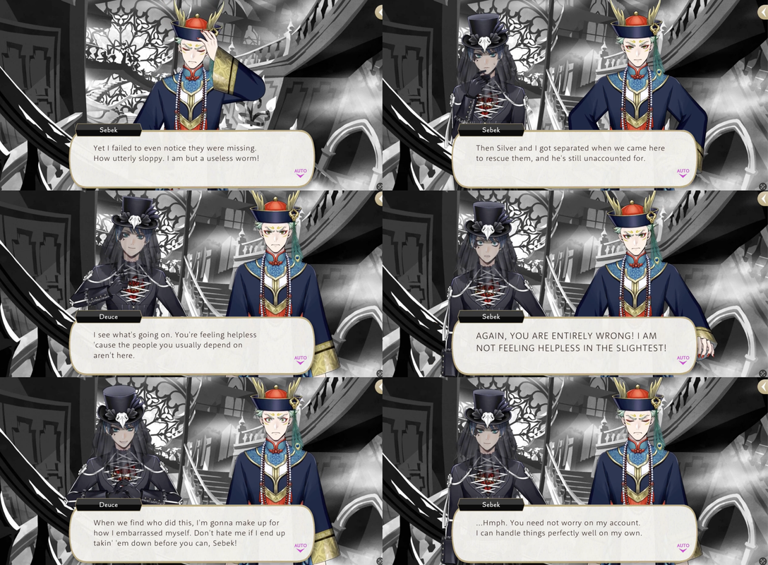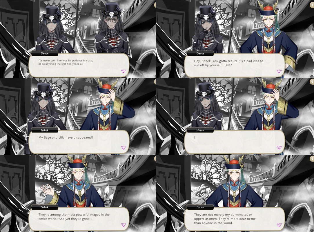 Deuce intercepts him, asking why he has been acting strange, and deduces the source of Sebek’s discontent: feeling helpless after being separated from Lilia, Malleus and Silver (Sebek claims he is not feeling helpless in the slightest).