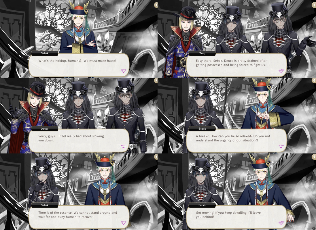 Deuce struggles to keep up with his group during Spectral Soiree, frustrating Sebek (“We cannot stand around and wait for one puny human to recover!”), who decides to leave the others behind and strike out on his own.