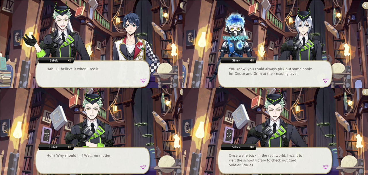 Initially Sebek responds “Why should I?,” but he then follows with, “Once we’re back in the real world, I want to visit the school library to check out Card Soldier Stories. I suppose I could pick out a suitable book or two for each of you while l’m there. After all, I DO pity all of you and your lack of appreciation for reading!”