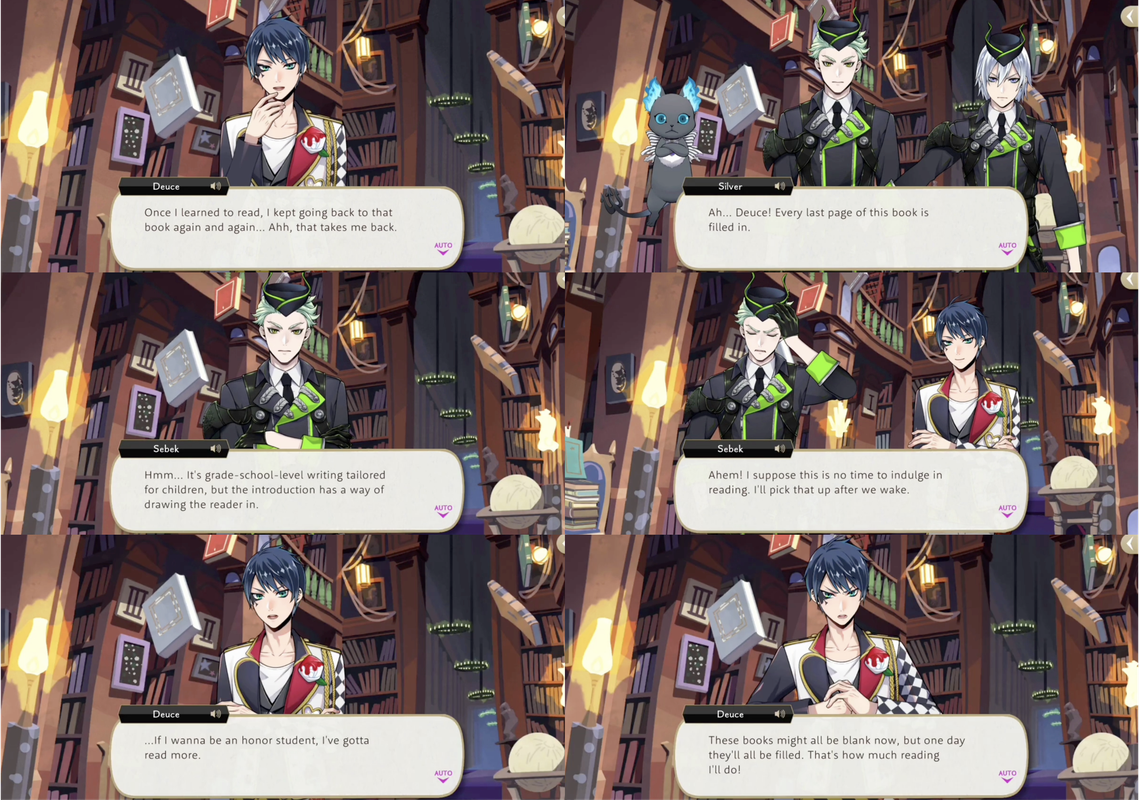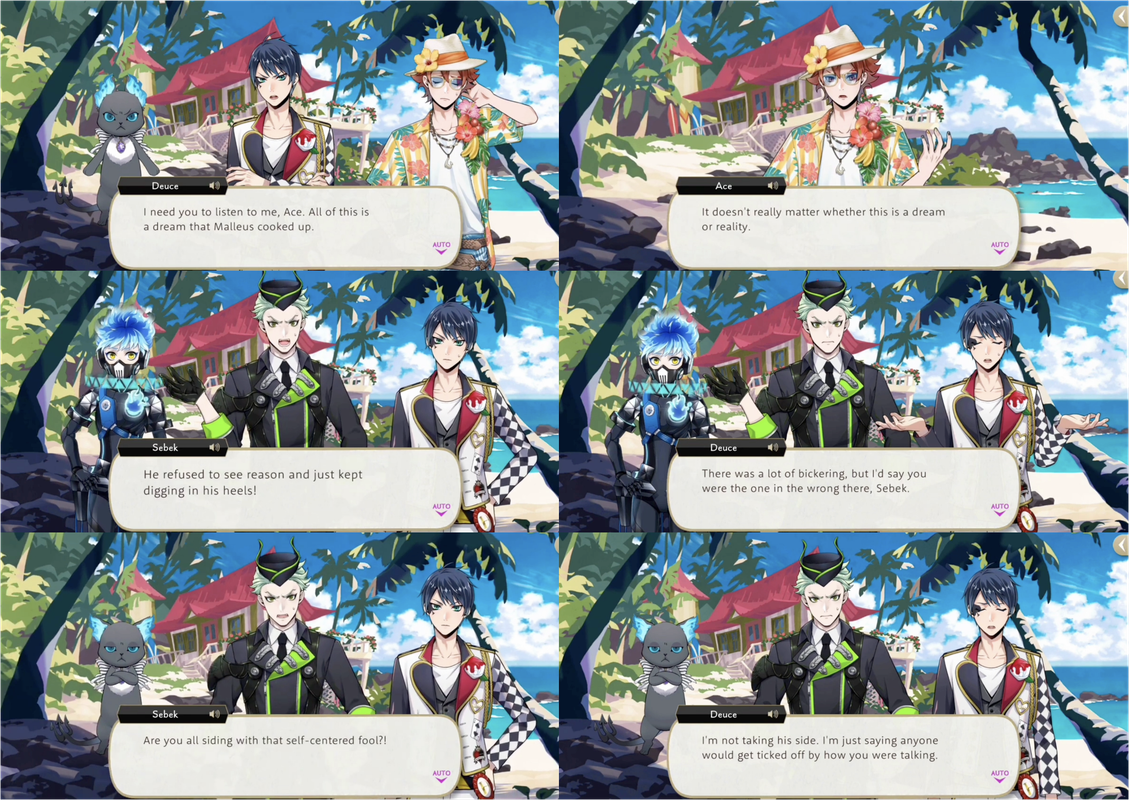 Later in Book 7 they fail to convince Ace that he is in a dream, and Deuce tells Sebek that he was in the wrong for how he went about it, saying, “I’m not taking (Ace’s) side. I’m just saying anyone would get ticked off by how you were talking.”
