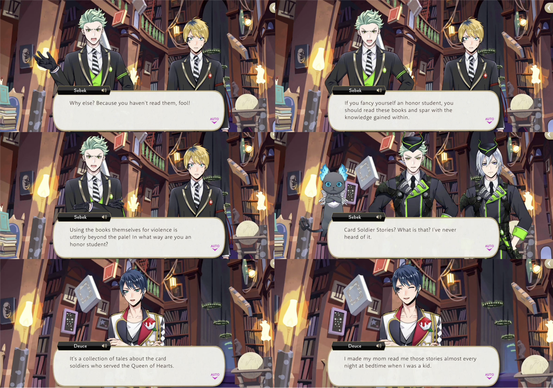 Deuce is revealed to have read just one book—a children’s book about the card soldiers who served the Queen of Hearts—which seems to intrigue Sebek: he decides to pick it up after they escape from the dream worlds.