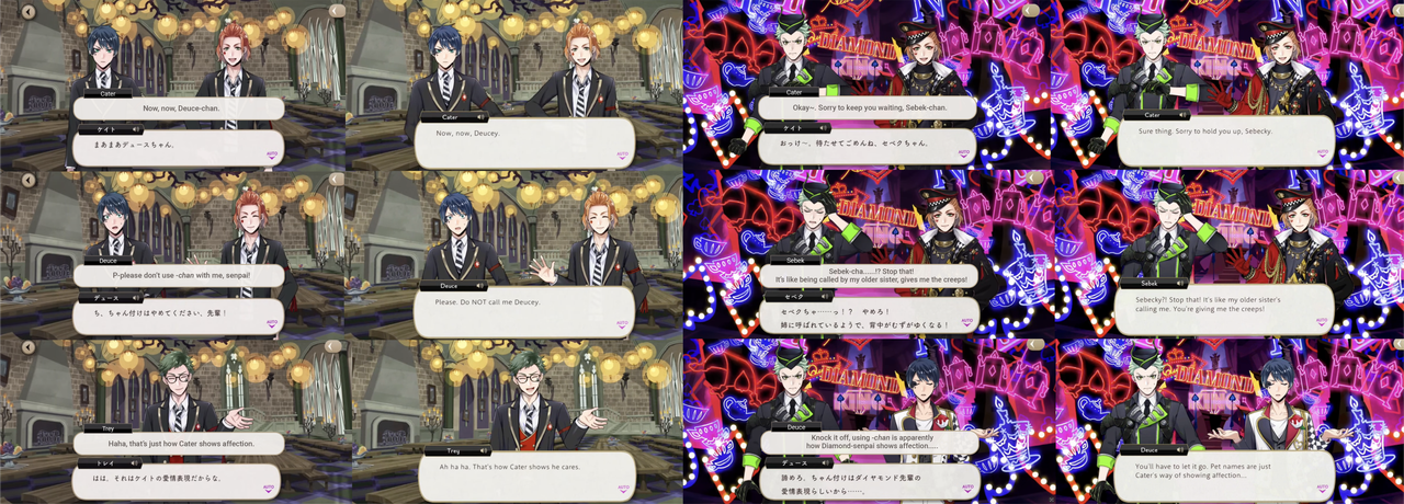 Sebek reacts with displeasure when Cater refers to him with the “-chan” honorific, much like Deuce himself did in Book 1.