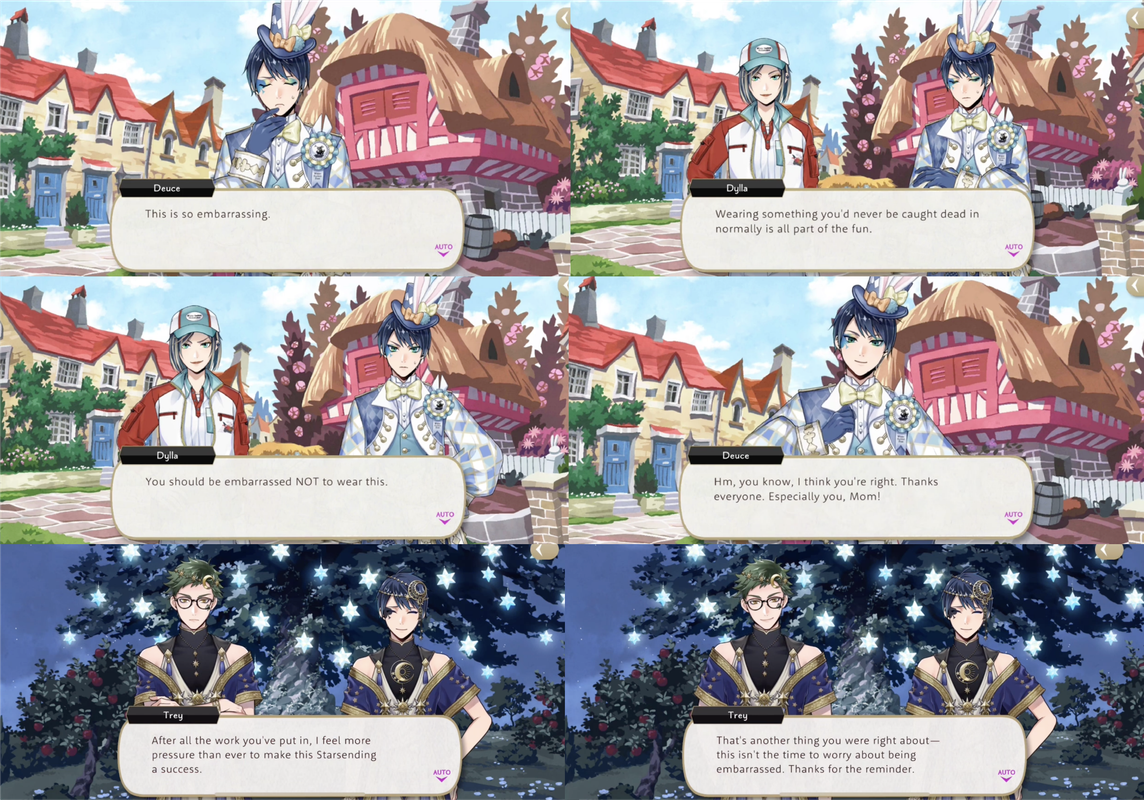 During White Rabbit Fes Deuce is similarly embarrassed by his outfit until his mother and the rest of the group reassure him, and by the end of Wish Upon a Star Trey says that Deuce was right: “this isn’t the time to worry about being embarrassed. Thanks for the reminder.”