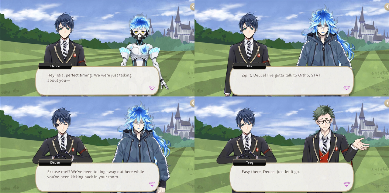 Trey holds Deuce back from fighting another student at the beginning of the Wish Upon a Star vignette, and again at the end when Deuce becomes frustrated with Idia.
