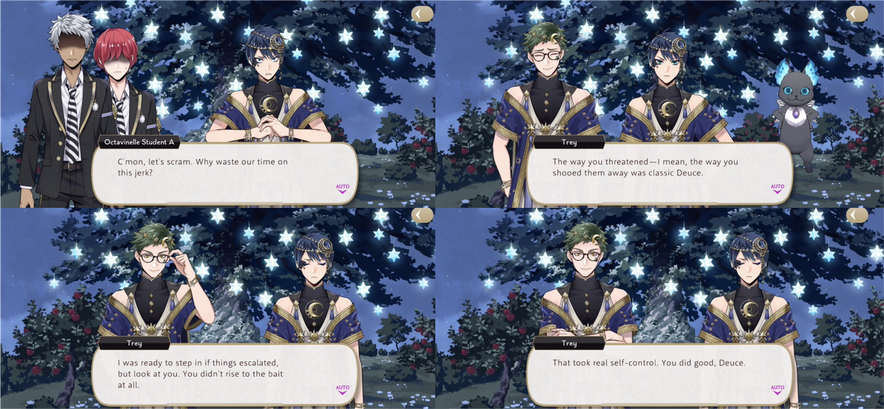 When Deuce threatens bullies during the event, successfully driving them away and saving the wishing stars, Trey says he had been intending to step in but Deuce had not risen to their bait: “That took real self-control. You did good, Deuce.”