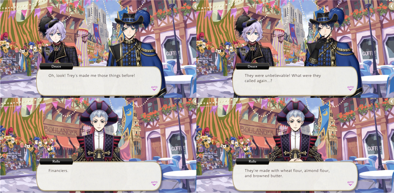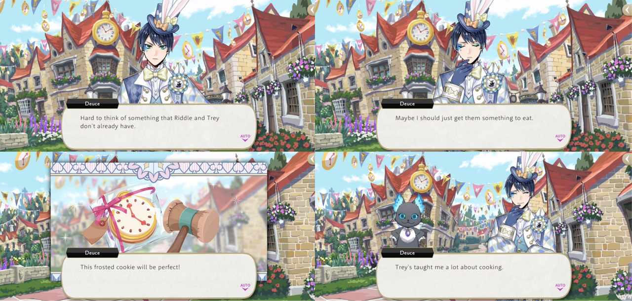 Deuce struggles to “think of something that Riddle and Trey don’t already have” while shopping for souvenirs in Clock Town, ultimately deciding to get them frosted cookies (“Trey’s taught me a lot about cooking”).