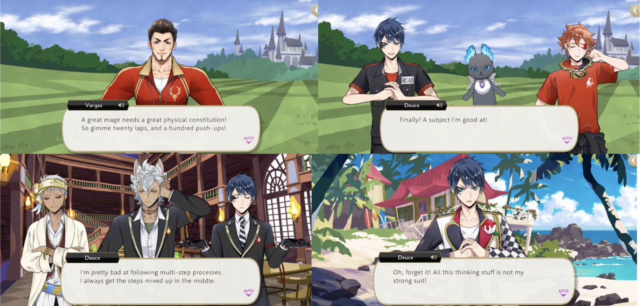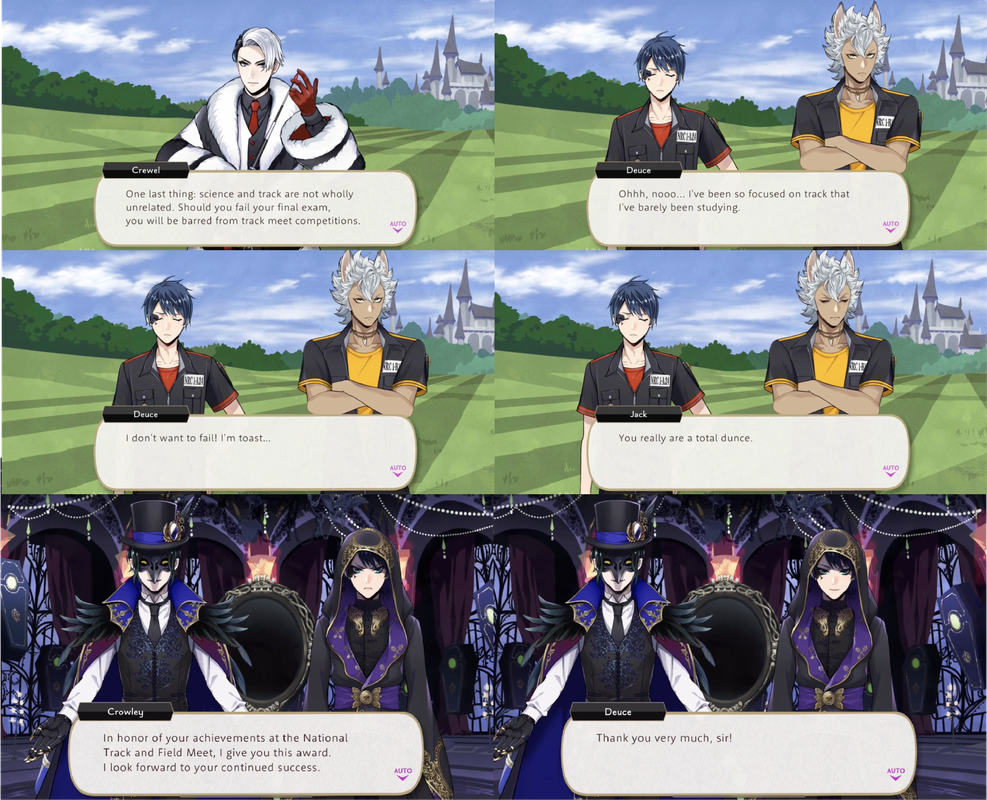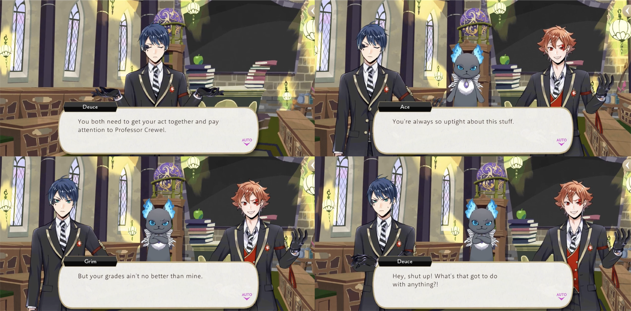 Deuce says his written exam grades “aren’t great” and we see him struggle in class with Crewel, with Grim saying that both he and Deuce had to take an extra class with Crewel because an answer Deuce gave on his homework was so wrong that “Crewel nearly yelled (their) ears off.”