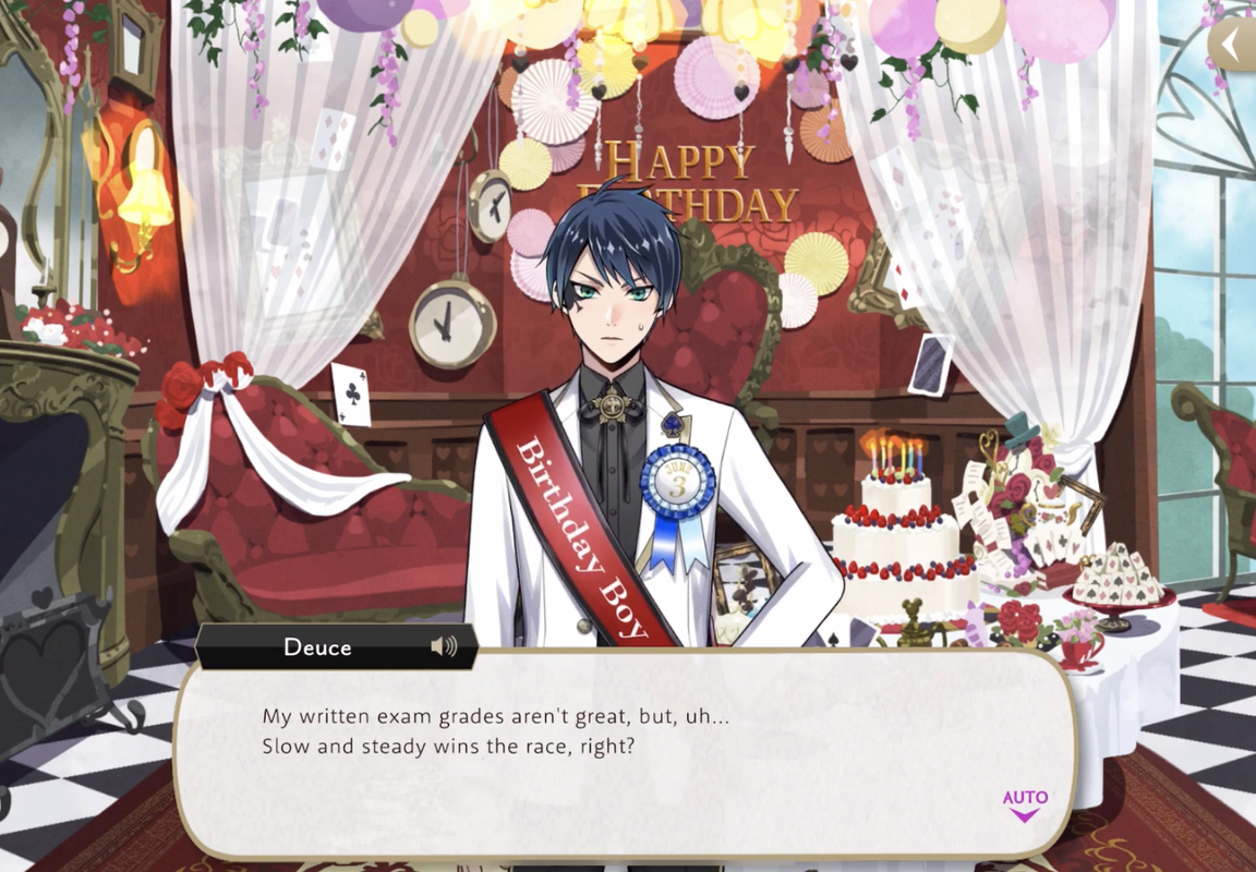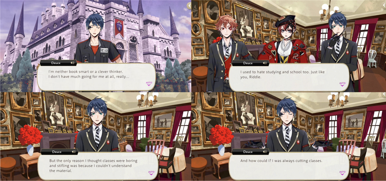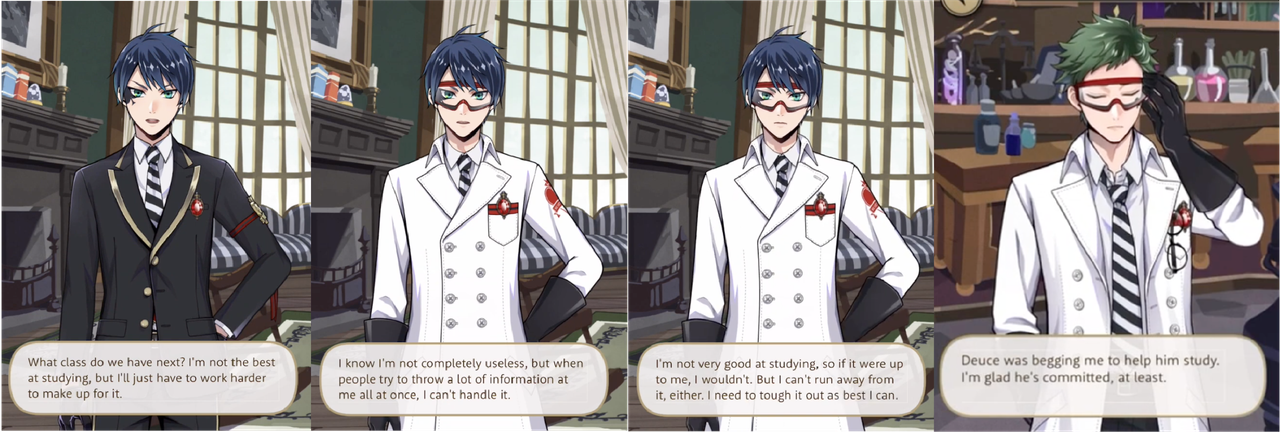 Deuce has voice lines of, “I know I’m not completely useless, but when people try to throw a lot of information at me all at once, I can’t handle it” and “I’m not very good at studying, so if it were up to me, I wouldn’t. But I can’t run away from it, either. I need to tough it out as best I can.”