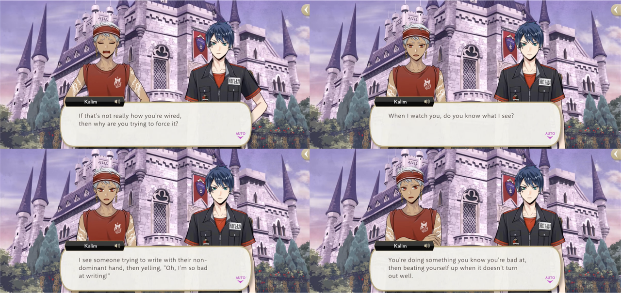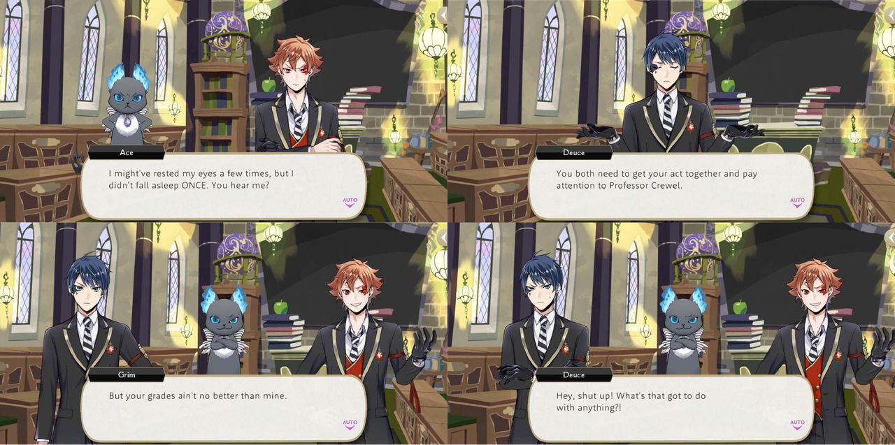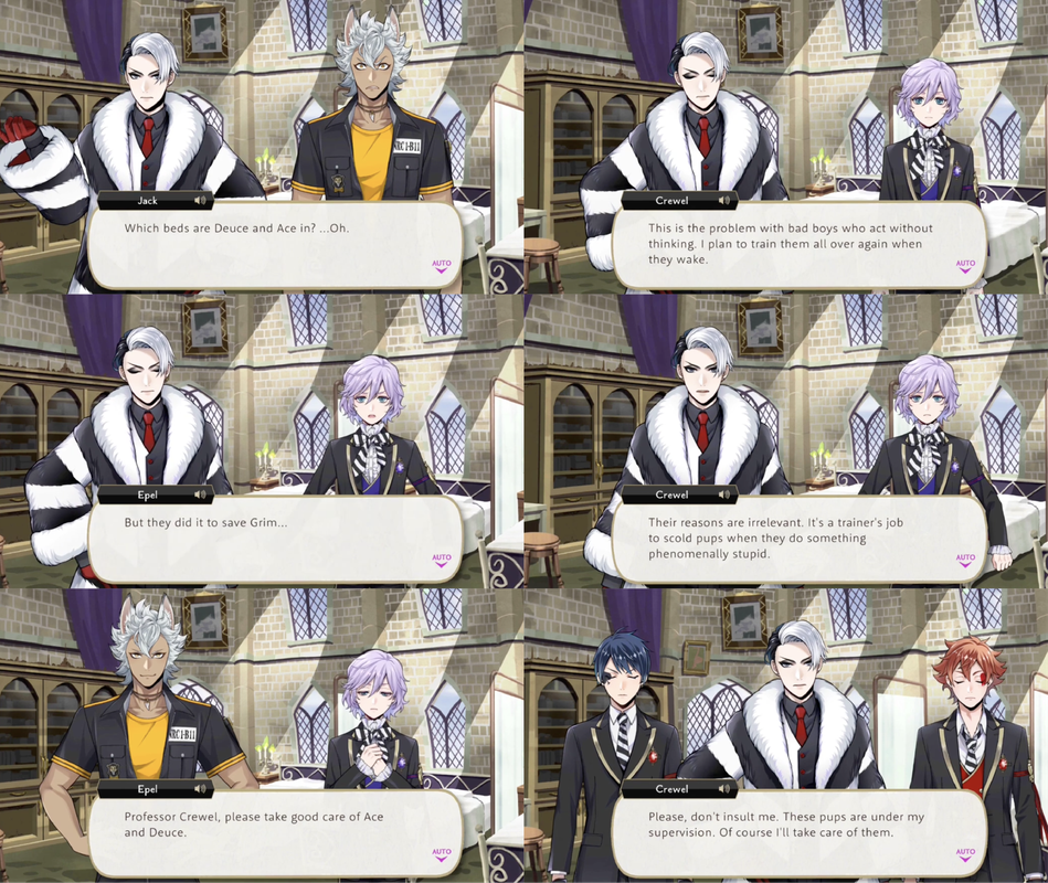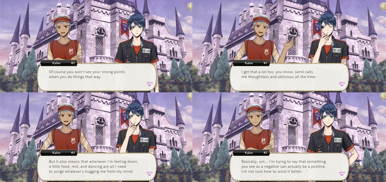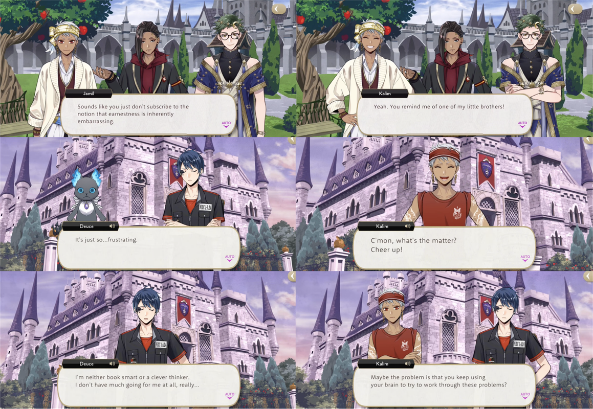 Deuce goes to Kalim and Jamil for help with his Starsending dance, where Jamil observes “just don’t subscribe to the notion that earnestness is inherently embarrassing” and Kalim says that Deuce reminds him of his little brothers.