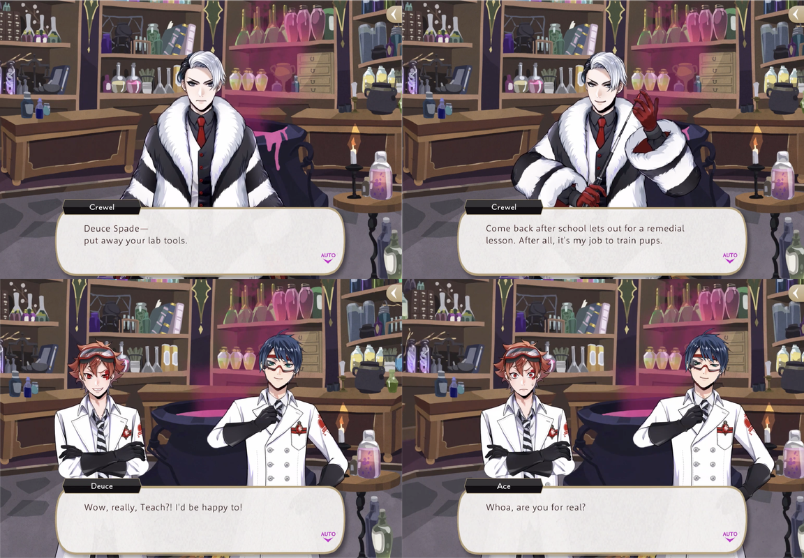 Deuce possibly likes Crewel (and spends more time with him, due to remedial lessons and tutoring) than other students. When assigned a remedial lesson with Crewel he reacts with “I’d be happy to!.”