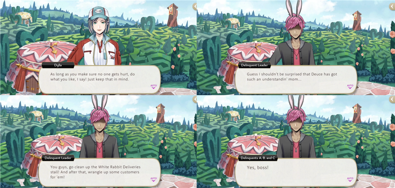 The leader sends his friends to clean up the White Rabbit Deliveries stall, “and after that, wrangle up some customers for ’em!”