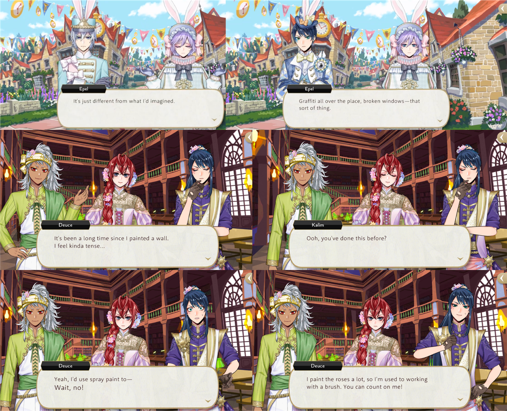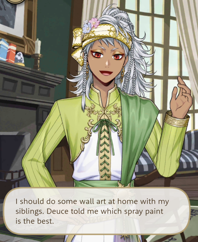 When asked if he has done such a thing before Deuce responds, “Yeah, I’d use spray paint to—Wait, no!,” and claims his experience comes from painting roses at Heartslabyul.