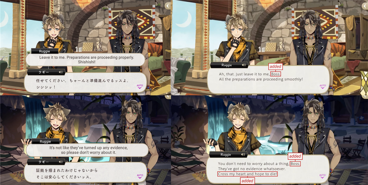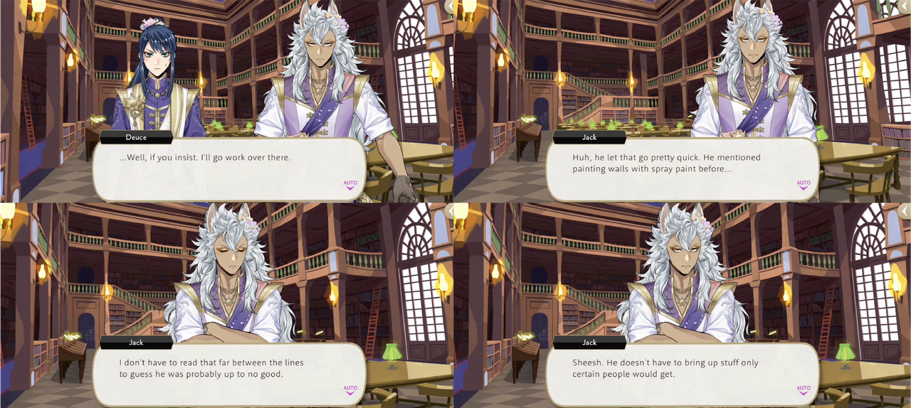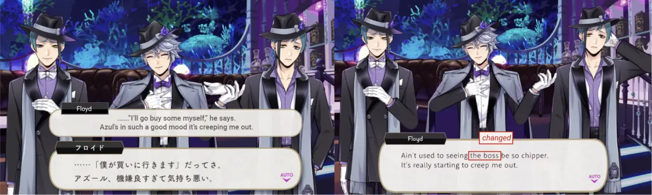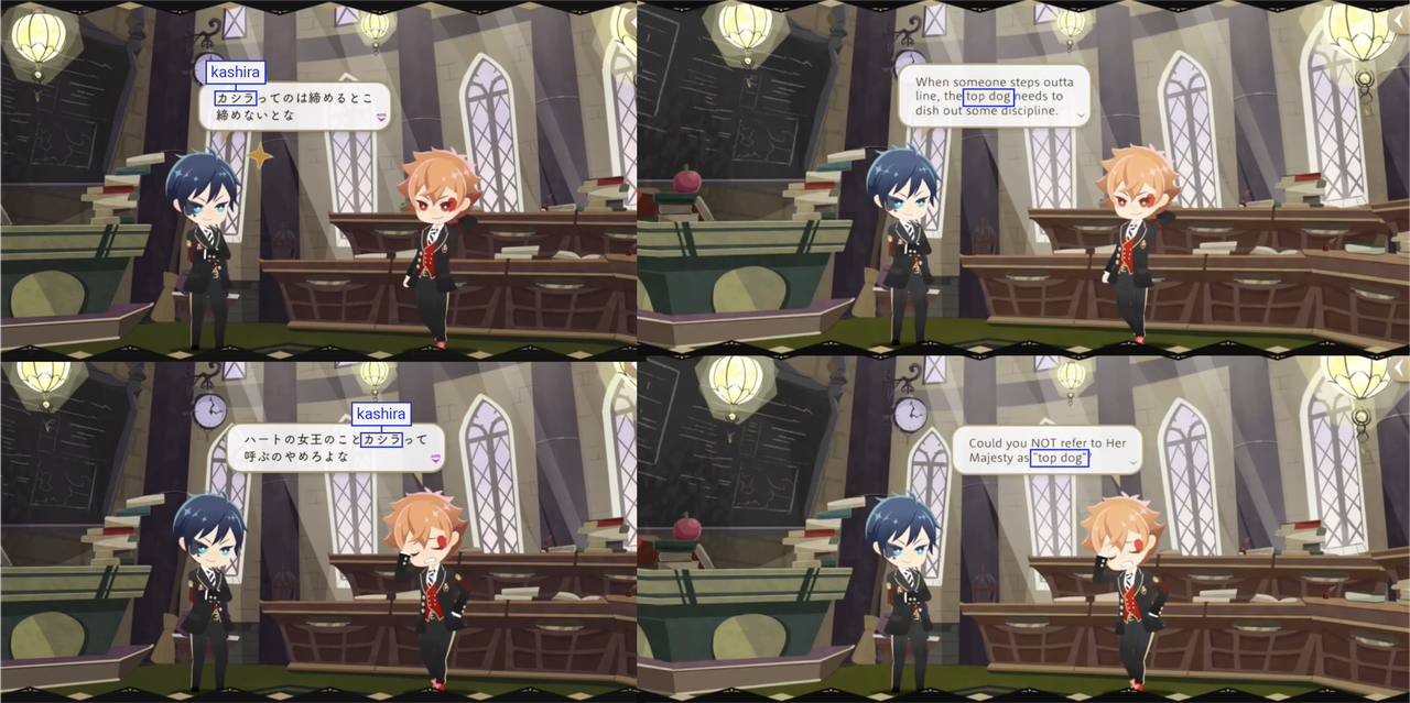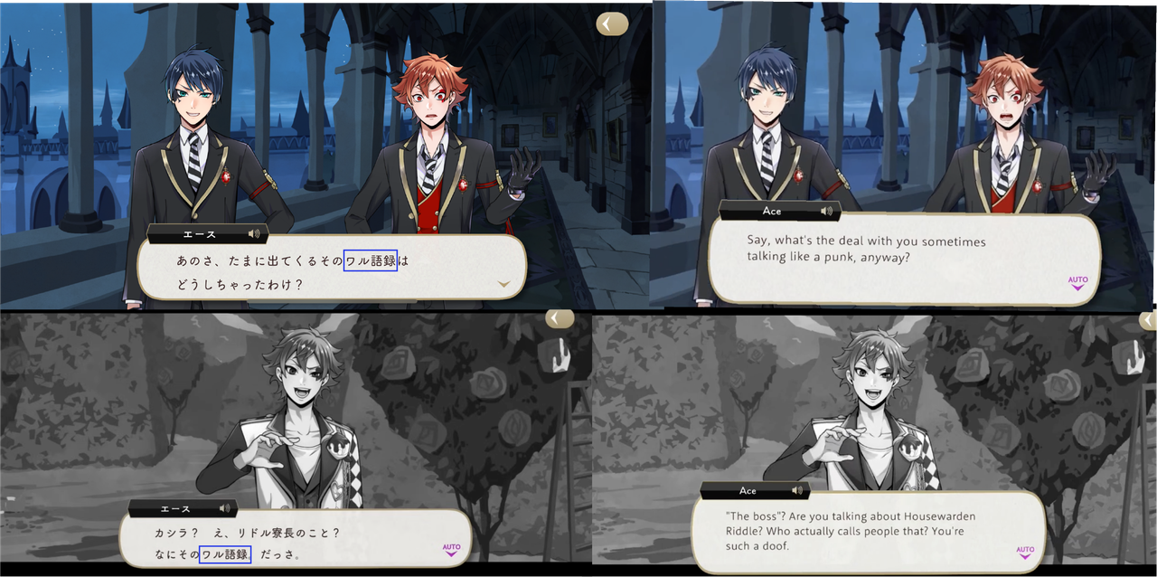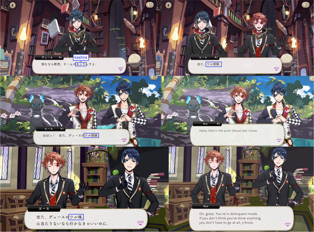 ※Note: While “boss” is a perfectly accurate translation of kashira, it might not be having the same effect on EN, as EN will add the word “boss” to places it was never said (re: Ruggie to Leona, the twins to Azul) but Deuce is the only character in the game to use the word “kashira,” which is why it stands out and why Ace calls him out on it but not any of the other characters who also say “boss” on EN: it is supposed to be unique to Deuce’s speech patterns.