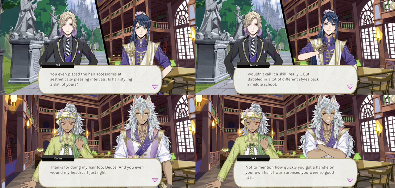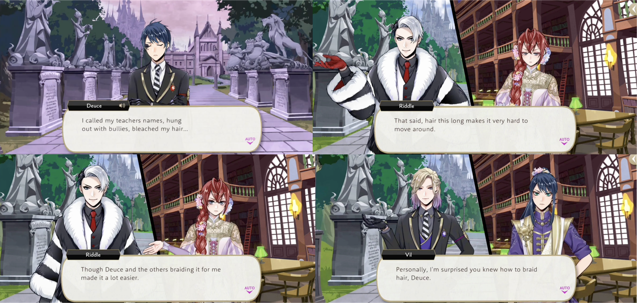 In the lantern event we learn that Deuce experimented with a variety of different hairs styles back in his 不良 days: he does his own hair as well as everybody else’s, even placing hair accessories “at aesthetically pleasing intervals” for Riddle, impressing Vil.