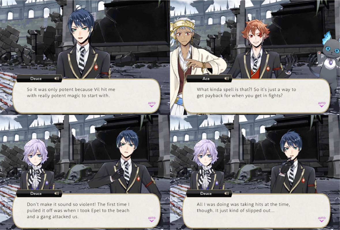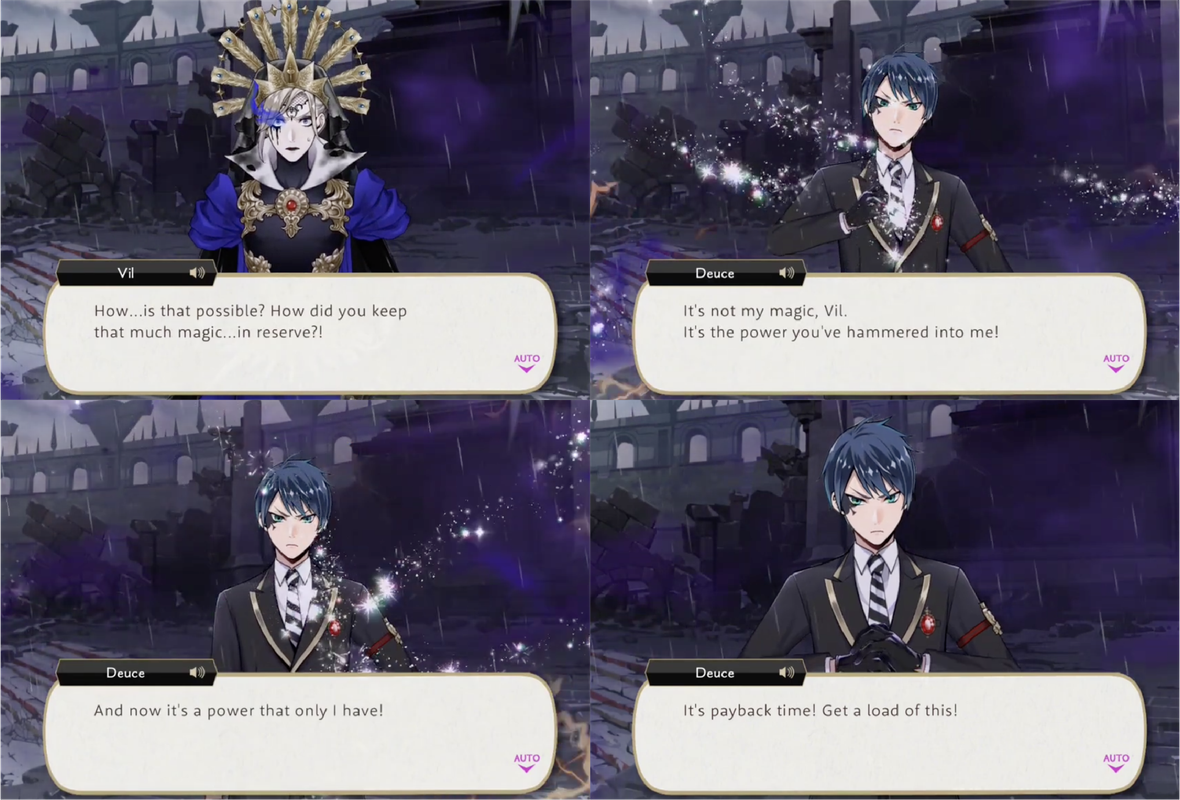※ Note: there is a common misconception non EN that Deuce’s unique magic “doubles” the strength of the magic that is hammered into him when he strikes back, possibly based on the localization of his UM (EN: “Double Down”), but this is not true.