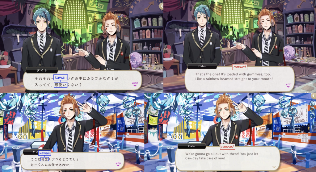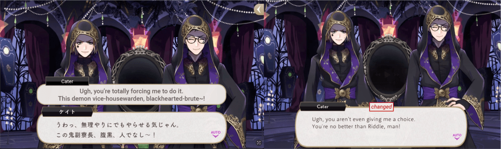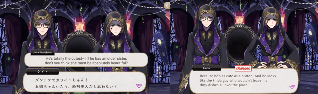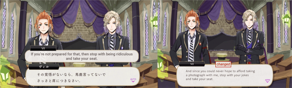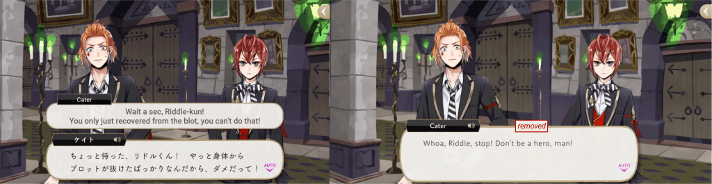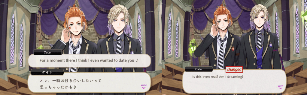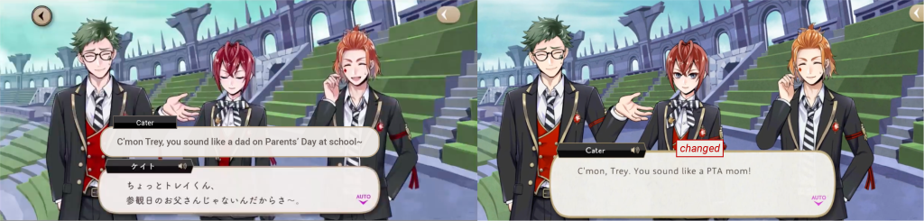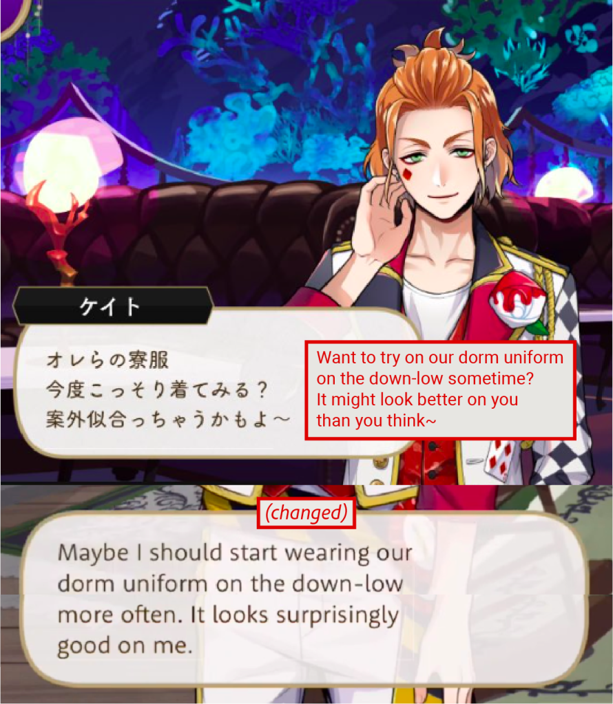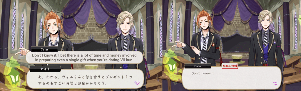 Also removed from the English-language adaptation of the game was Cater’s line about wanting to date Vil, and Vil responding that he is too expensive for Cater to afford.
