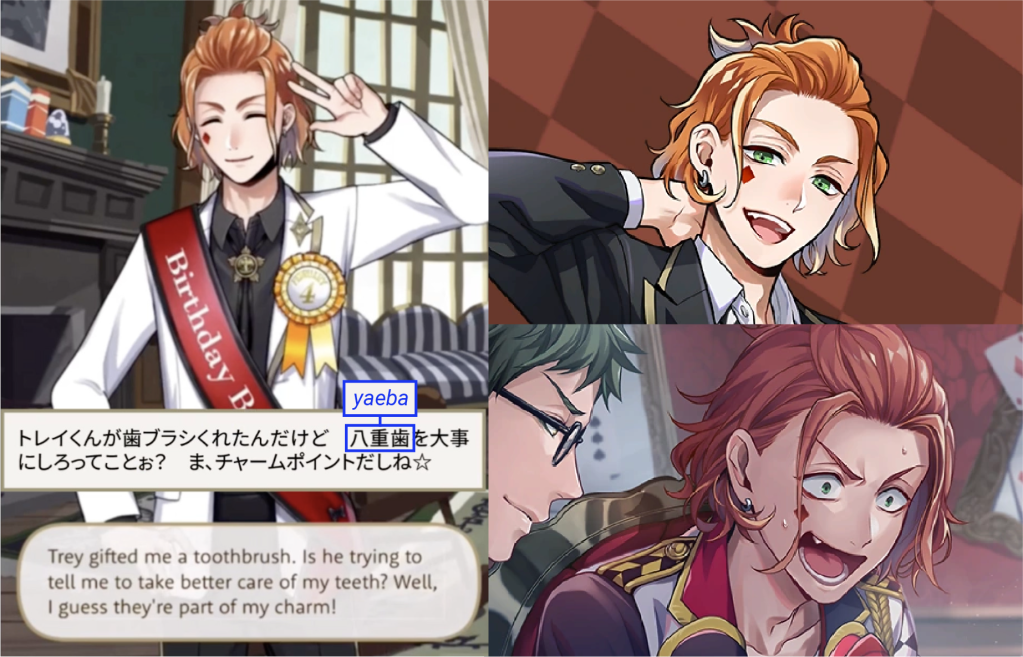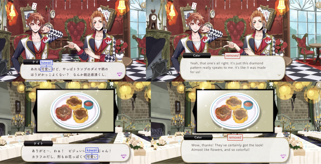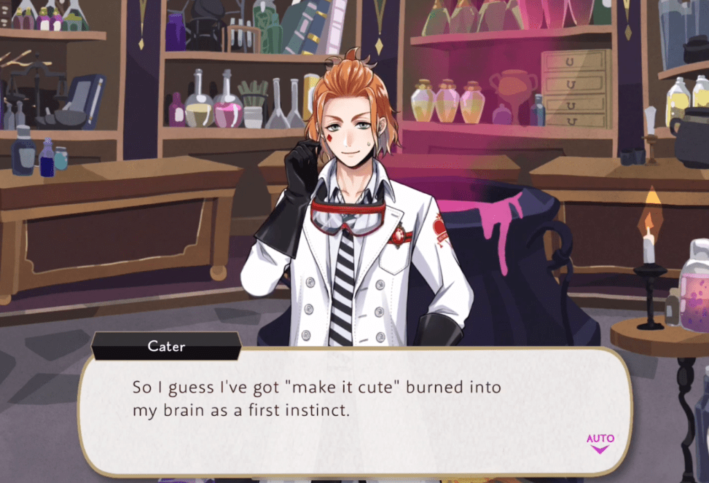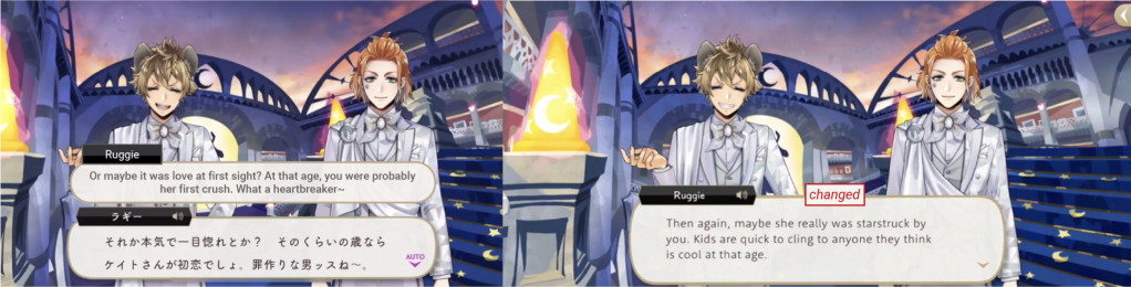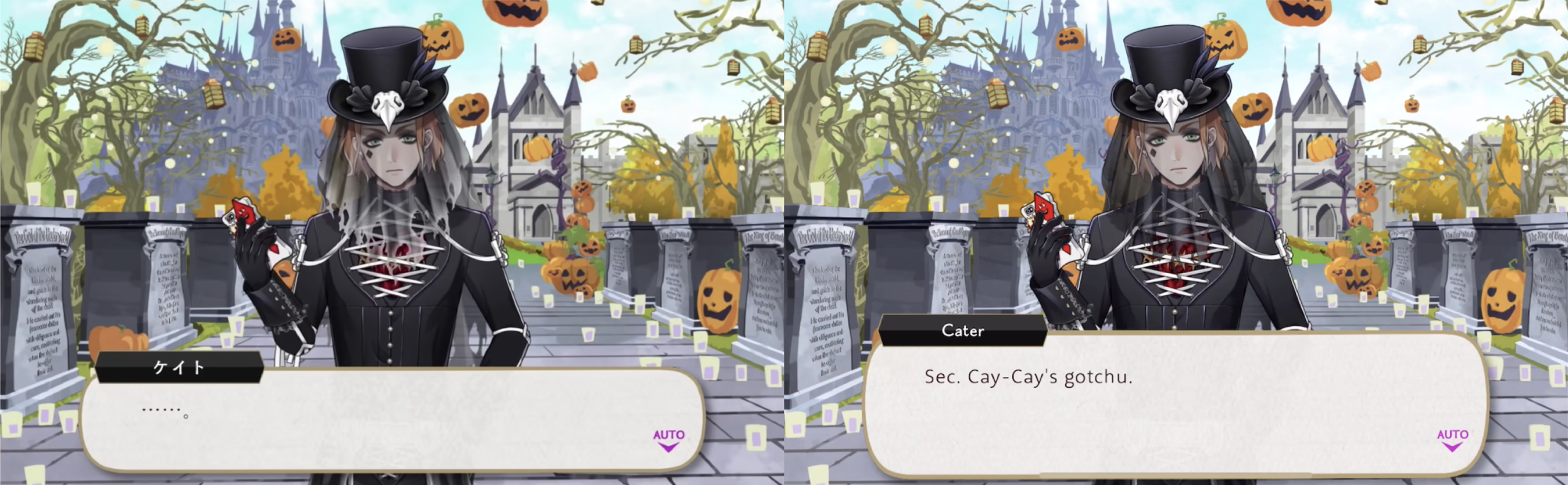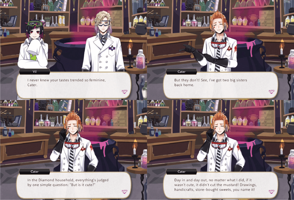 Also removed from the English-language adaptation of the game was Cater’s line about wanting to date Vil, and Vil responding that he is too expensive for Cater to afford.