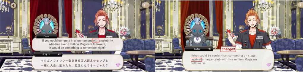 A small change, but if you thought it was odd that Cater commented on competing “against” Vil in Book 5, you are correct: it was originally “competing with,” changed for EN.