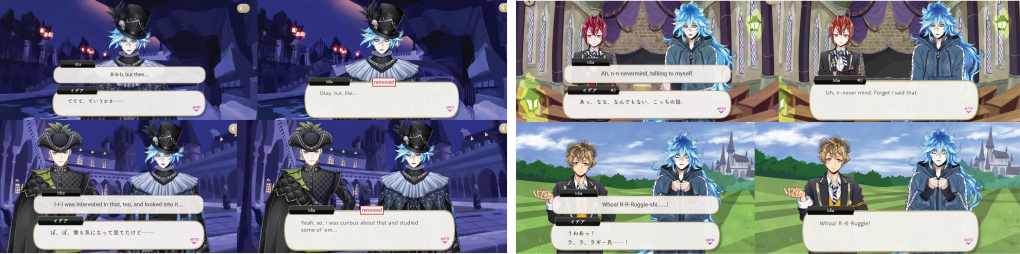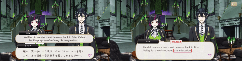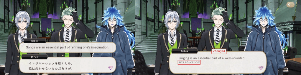 This resulted in lines like “Blue handkerchiefs…ah, ah, th-th-the glass mobiles seem to be less simple than these…” becoming “Plain blue handkerchiefs? Um, no offense, but these look way more basic than those glass mobiles…” and “B-b-b-but then…” becoming “Okay, but, like…,” making the EN adaptation of Idia maybe sound more assertive than the original.
