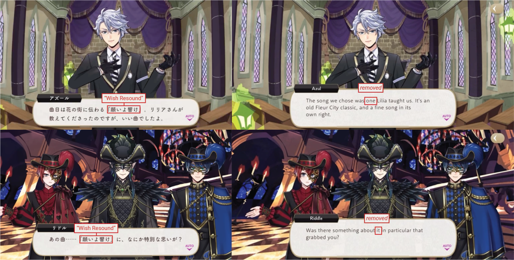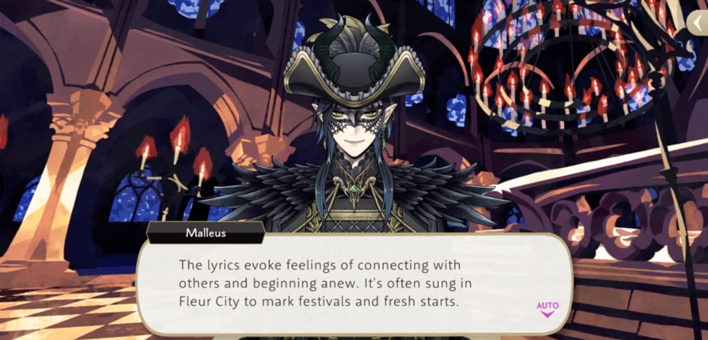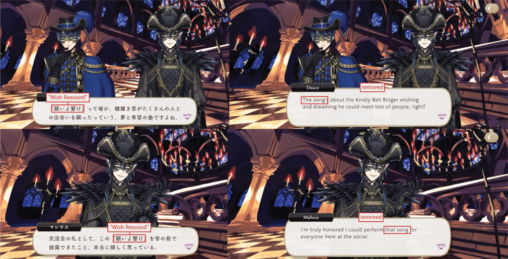 Much like how the lyrics to the song “Piece of My World” were removed from Book 5, the lyrics to Malleus’ song “Wish Resound” were also removed from the English-adaptation of the game.