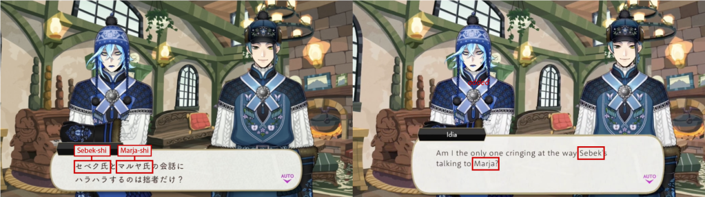 Both Jade and the village mayor refer to Marja with the “-san” honorific, but as it has been dropped from EN, it makes Sebek’s way of speaking normal, making Idia’s first comment about “No Ms. or Mrs.?” seem like it is what is out of place, when in reality, Sebek is the odd man out.