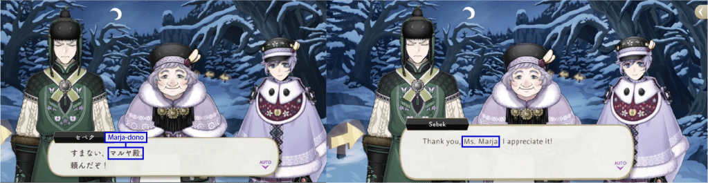 Later on in the game Sebek does add “Ms.” to her name on EN. Originally he is referring to her as “Marja-dono.”