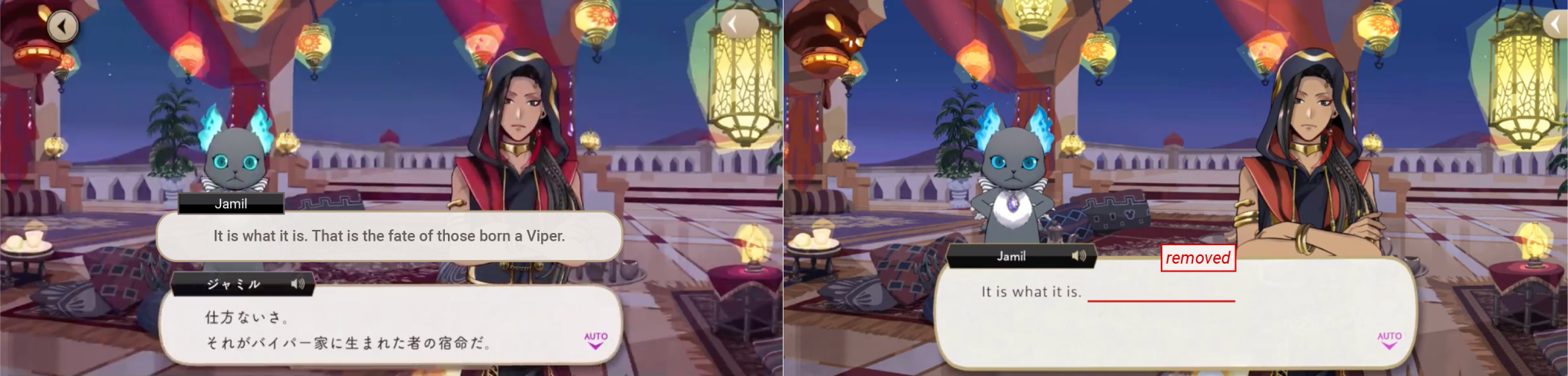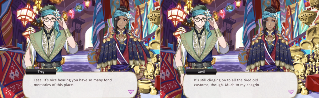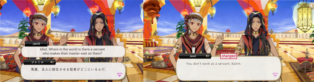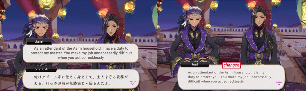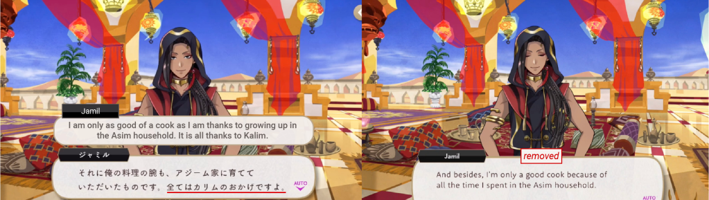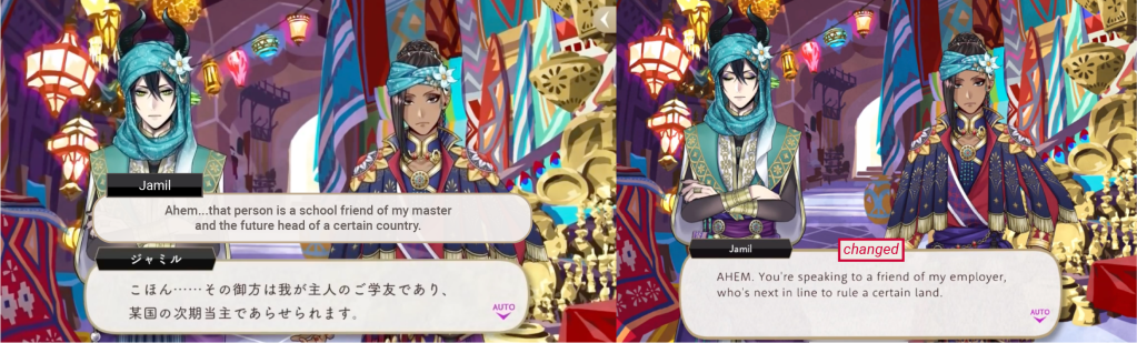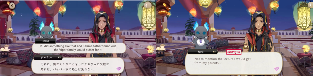 In the original game Jamil expresses concern that Kalim’s father would make his family suffer if he ever stood up for himself, but this was changed on EN to Jamil worrying about a lecture from his parents.
