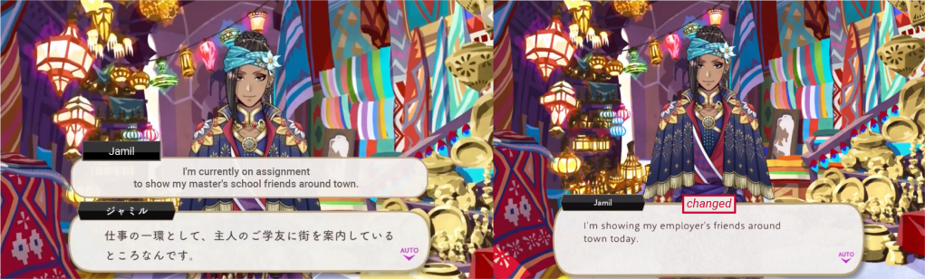 In a birthday vignette, Jamil is asked what he would teach a parrot to say if he were to have one as a pet. His answer of “Master” was changed to “Hello” in the English-language adaptation of the game.