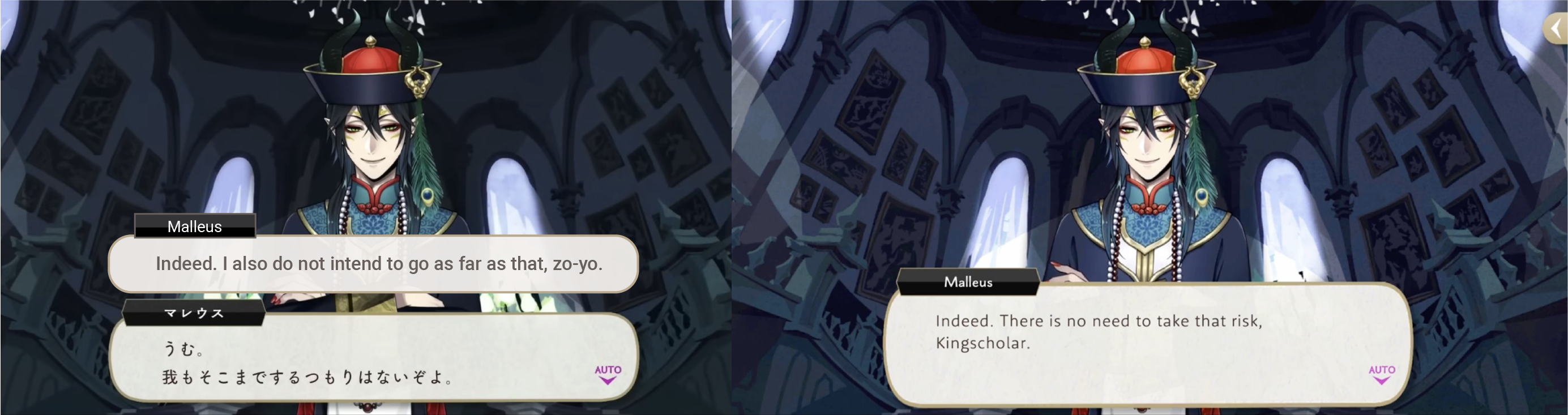An attempt was made by translators to uphold the old-fashioned speech patterns of the ghosts that we met throughout the game, but it maybe might have been confusing to try to convince EN players that Leona caught on to inconsistencies in Malleus’ efforts to speak like a ghost.
