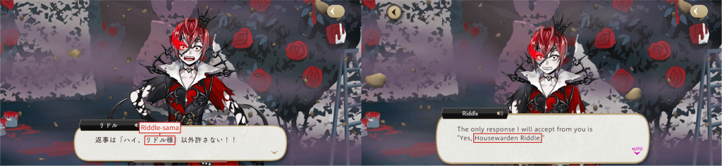 In the original game, Riddle has the mental collapse that comes with overblot represented by a demand that he be called “Riddle-sama.”