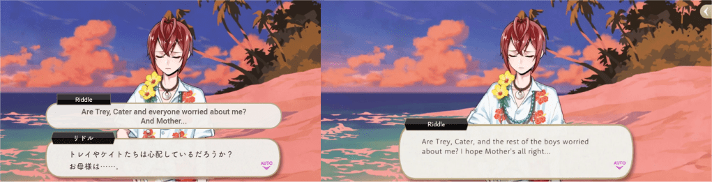 (In the original game Leona is the only character who is aware of the simulation from the moment it begins. In Riddle’s localized line on EN it sounds as though he still remembers that Idia and Ortho are behind their situation, when he actually is not. This is important enough to the story that Idia even comments on how Leona is probably the type to always know when he’s dreaming, which comes into play in Book 7.)
