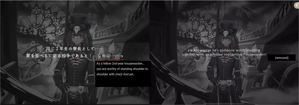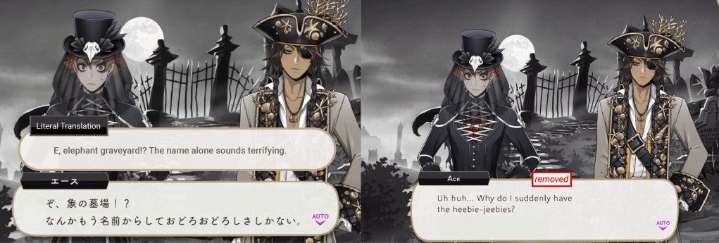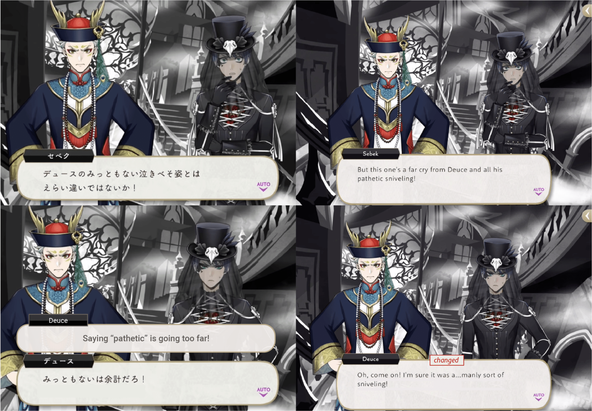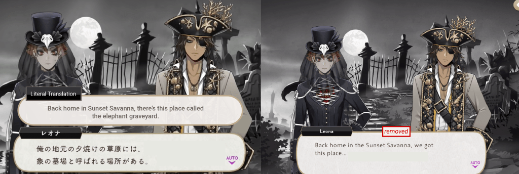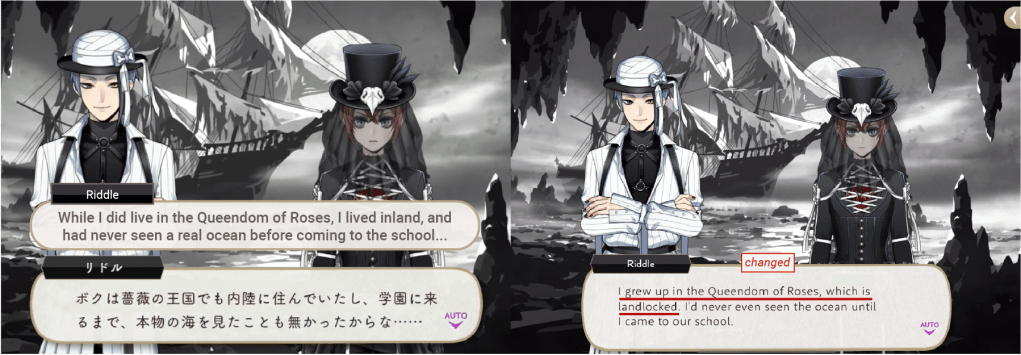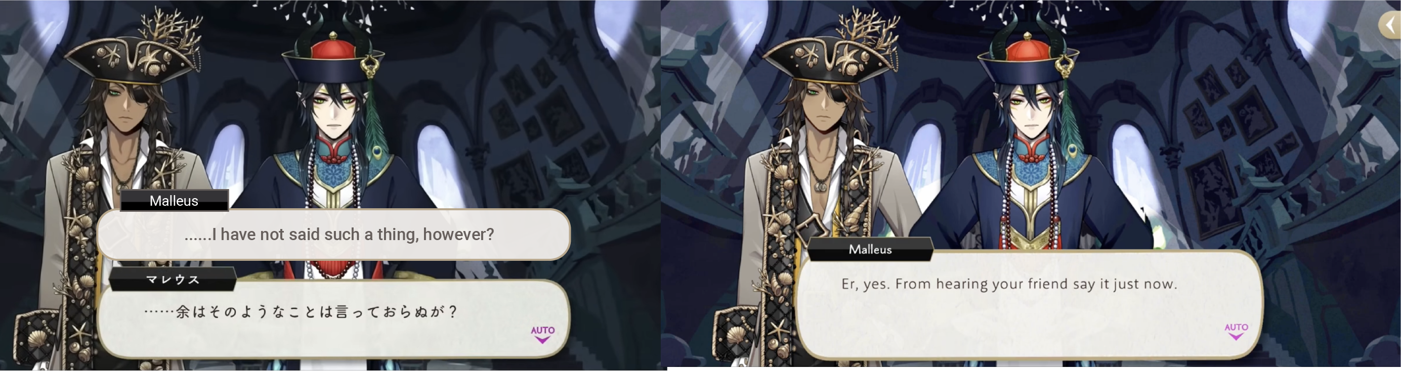 Pronoun swapping isn’t really something that can be portrayed in English, so the entire exchange was rewritten for EN. An attempt was made by translators to uphold the old-fashioned speech patterns of the ghosts that we met throughout the game, but it maybe might have been confusing to try to convince EN players that Leona caught on to inconsistencies in Malleus’ efforts to speak like a ghost.