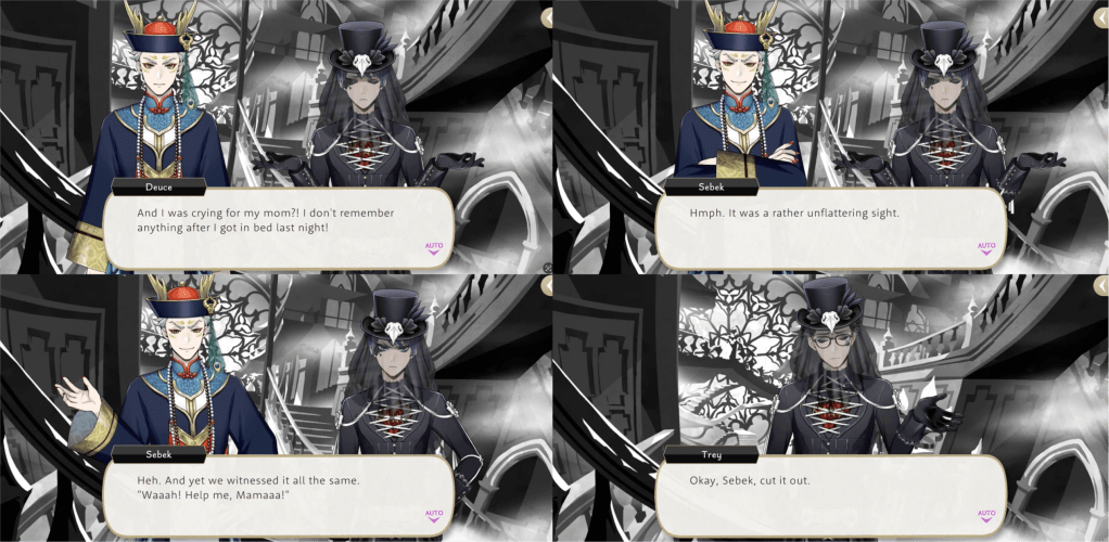 But we also have the scene above where Sebek mocks Deuce for crying and Sebek reprimands him. While it’s not technically impossible that Trey is saying he has been making fun of Deuce somewhere separately that we did not see, it would be grammatically off as Sebek was set as the subject at the beginning of the conversation, making the EN translation a slip of subject pronouns.