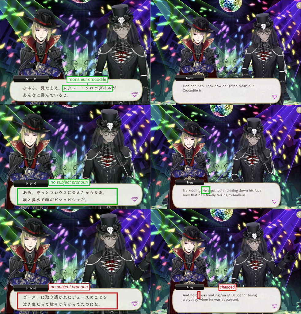 A: Yes. But the translators were able to tell from the context that Trey is obviously not describing himself, he is describing Sebek, and they correctly introduced the subject “he” into the English-language translation. For some reason this didn’t make it to Trey’s follow-up line.