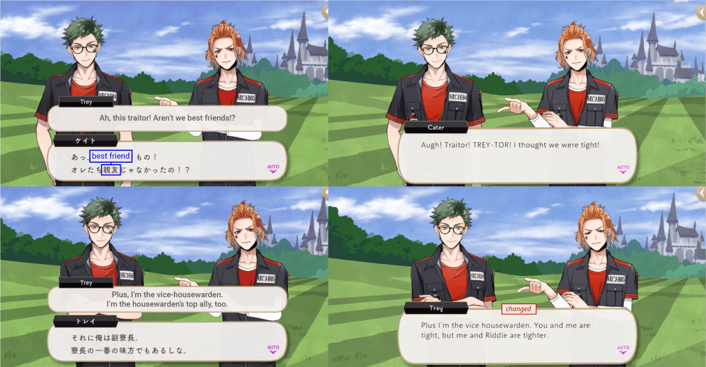 (And Cater’s use of “best friends” may be significant–the word in the original game, 親友, has only been used by three other characters in the entire game: Kalim to Jamil, Deuce to the Prefect and Lilia about Raverne.)