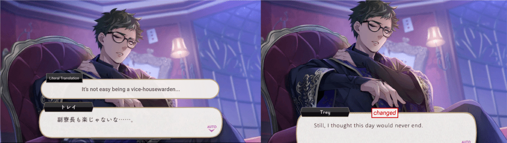 When Deuce tells Trey he has a very “older brother” vibe about him, in both languages he asks “Is that what I’m like?”, but Trey’s original dialogue continues with “I’m not doing so on purpose,” which was removed from EN.